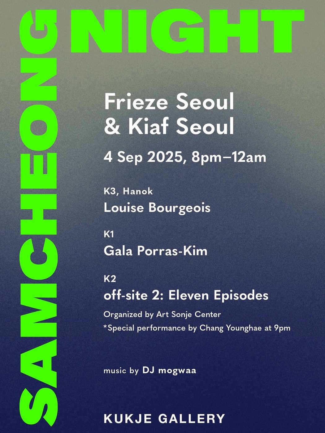 국제갤러리에서는 루이즈 부르주아와 갈라 포라스-김의 개인전이 함께 열리며, 갈라 포라스-김의 아티스트 토크가 오후 6시에 예정돼 있다. <아트리뷰> 편집장 마크 래폴트와의 대담에서 사물이 제작·인식·보존되는 방식을 규정하는 분류 체계와 소장품 문화를 중심으로 포라스-김의 예술적 관심을 깊이 들여다보는 시간이 될 것이다. 이어 오후 8시부터는 모과의 디제잉 퍼포먼스가 무대를 잇는다.