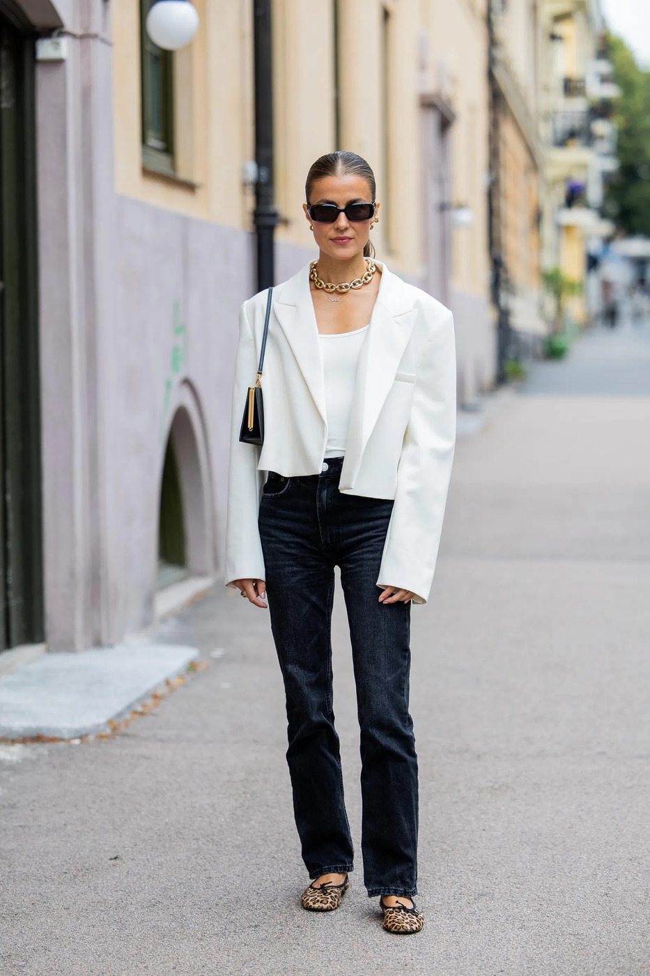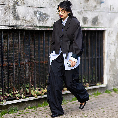블랙 워싱 데님은 자칫 밋밋할 수 있습니다. 하지만 레오파드 패턴 발레 플랫과 만나면 이야기는 달라지죠. 데님의 쿨한 무드와 패턴의 과감함이 묘하게 섞이며 오피스에서 기대하지 못한 스타일이 연출됩니다. 크롭트 블레이저와 뉴트럴 톤 슬리브리스 톱을 곁들이면 단순한 업무용 복장을 넘어 고정관념을 깨는 세련된 오피스 룩이 완성되고요!