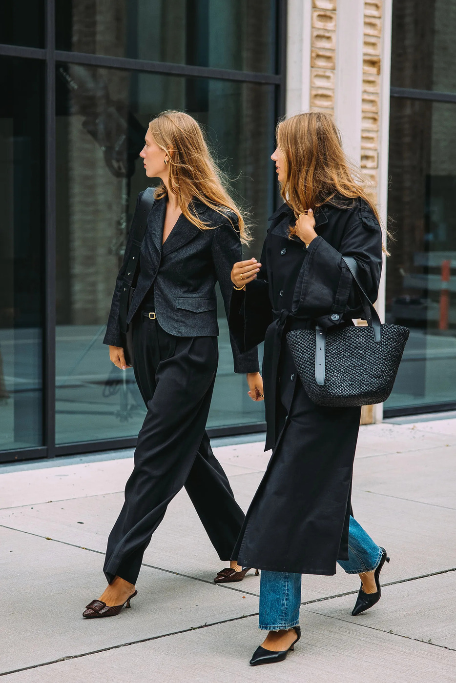 슬림한 블루 진은 언제나 오피스 친화적이죠. 키튼 힐을 더하는 순간 룩은 단번에 격상되고요. 작은 굽이 주는 안정감과 미묘하게 드러나는 페미닌 무드는 어떤 분위기의 회의실에서나 존재감을 발휘합니다. 블랙 트렌치 코트와 오버사이즈 백을 더하면, ‘역시 이 사람은 준비된 사람’이라는 인상을 주기에 충분하겠죠?
