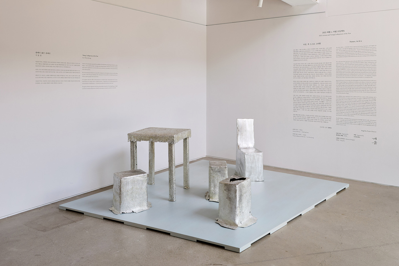 예올은 20년 넘게 한국의 문화유산을 보존, 계승하는 데 힘써온 재단법인입니다. 그리고 샤넬은 2022년부터 예올과 함께 올해의 장인과 올해의 젊은 공예인을 1인씩 선정해왔죠. 2025년 올해의 장인에는 지호장 박갑순, 올해의 젊은 공예인에는 금속공예가 이윤정이 선정됐습니다. 한지와 풀을 섞어 완성한 종이 죽으로 생활용품을 만드는 박갑순 장인, 금속으로 제작한 가구를 선보이는 이윤정 작가의 작품은 전시 <자연, 즉 스스로 그러함>에서 감상할 수 있습니다.