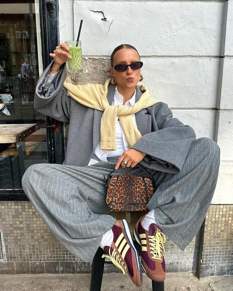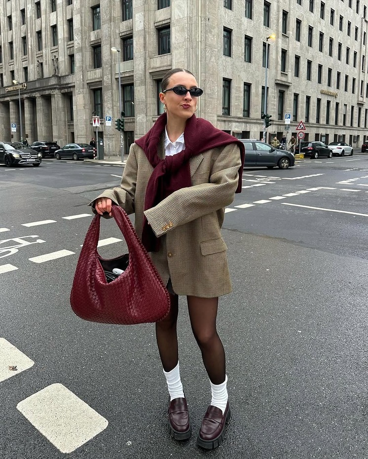 가을 재킷은 니트를 만나야 제맛이죠. 버건디 니트를 아빠 것 같은 클래식한 체크 재킷 위에 걸치면 단숨에 프레피 아이콘으로 격상됩니다. 백과 로퍼까지 톤을 맞추면 은은하게 가을을 접수할 수 있죠. 조금 더 위트 있게 연출해도 좋아요. 오버사이즈 그레이 재킷에 파스텔 니트를 목에 슬쩍 감싸주듯 얹고, 애니멀 프린트 백과 컬러감 있는 스니커즈를 곁들이면 더욱 유쾌한 무드를 연출할 수 있어요.