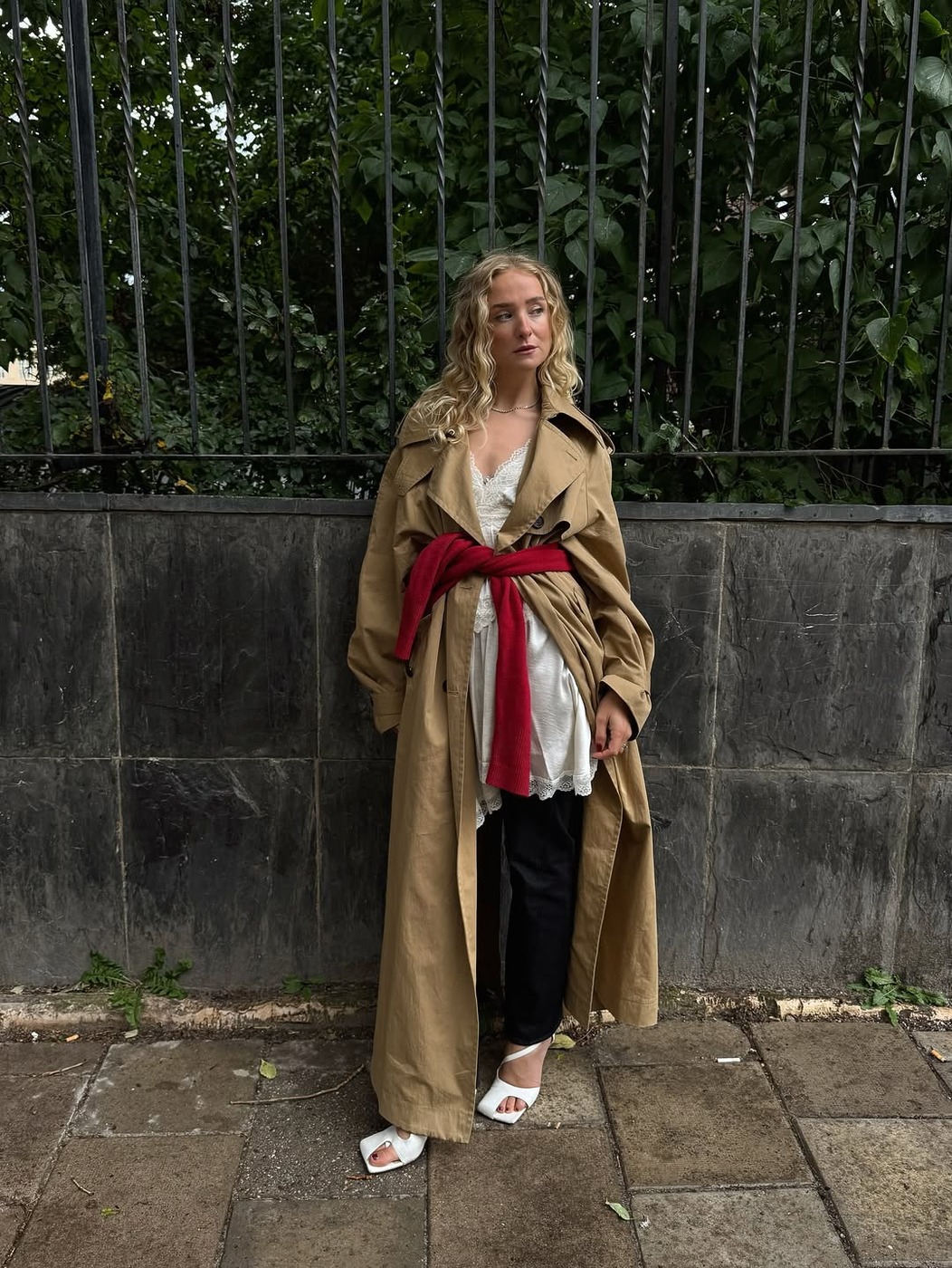 트렌치 코트를 입고 니트를 허리에 묶는 순간, 룩은 더 이상 클래식에 머물지 않습니다. 레드 니트가 벨트처럼 실루엣을 조이고, 동시에 컬러 악센트까지 책임지는데요. 단정한 듯 과감하고, 실용적인 듯 장난스럽습니다. 니트는 가을을 정의하는 액세서라는 걸 아는 사람이야말로 진짜 고수죠.