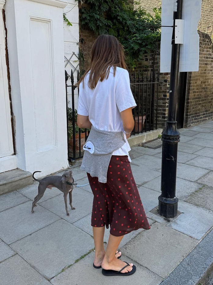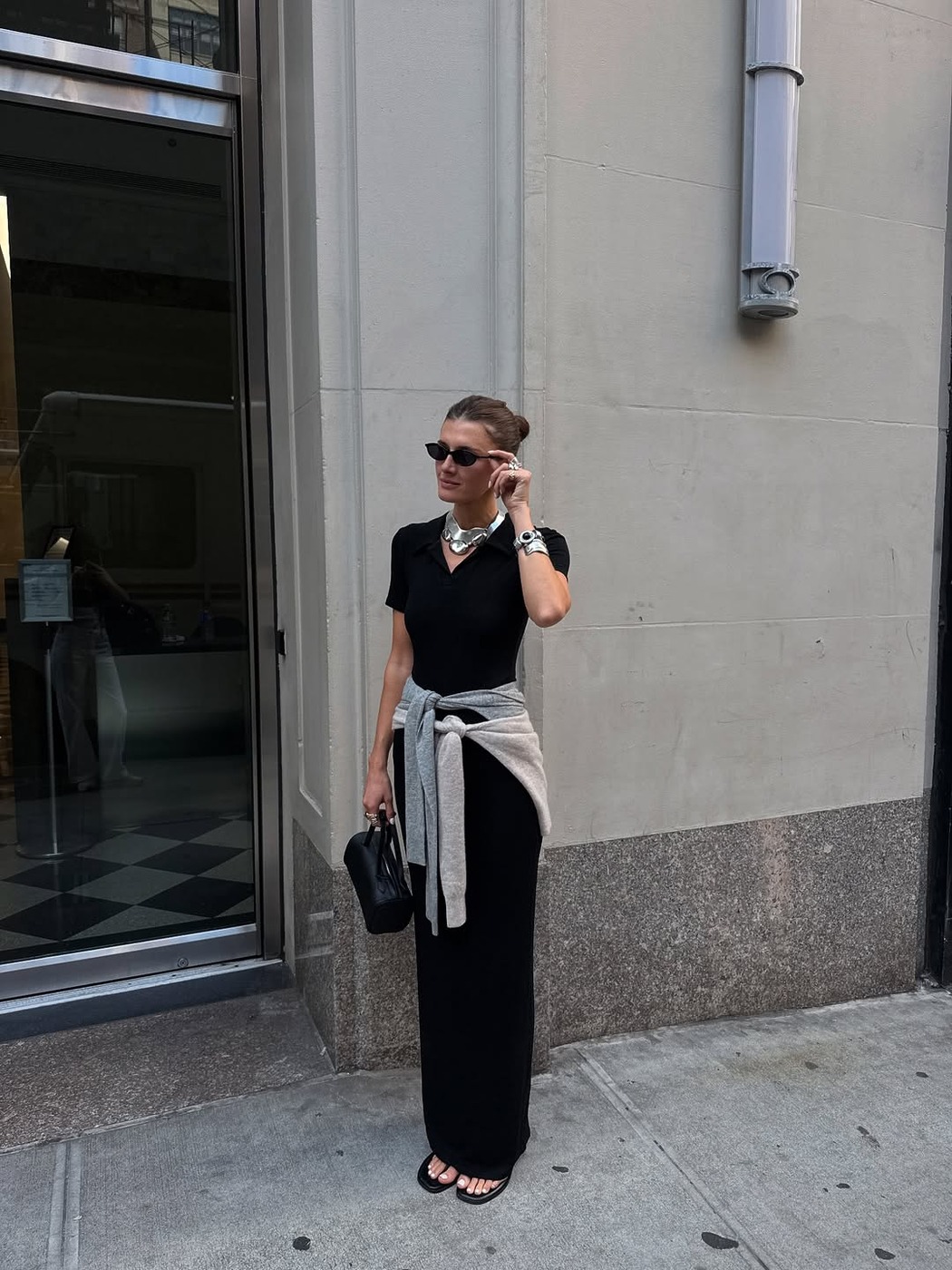 뜨거운 햇살과 선선한 바람이 공존하는 낮엔 니트를 허리에 묶는 게 정답입니다. 화이트 티셔츠에 실크 스커트를 매치하고 블랙 니트를 묶어주면, 여름의 시원함에 가을 무드를 덧입은 균형이 완성되죠. 바람에 살랑이는 스커트에 그레이 니트를 슬쩍 허리에 둘러도 계절의 전환이 자연스럽게 스며듭니다. 굳이 입지 않아도, 묶어주는 것만으로도 여름과 가을을 우아하게 넘나들 수 있죠.