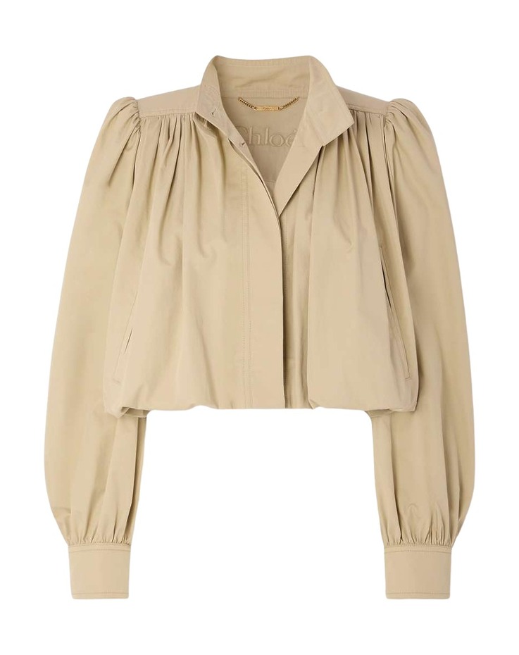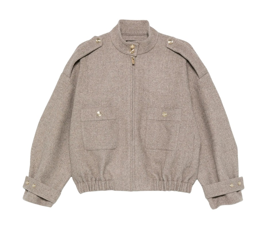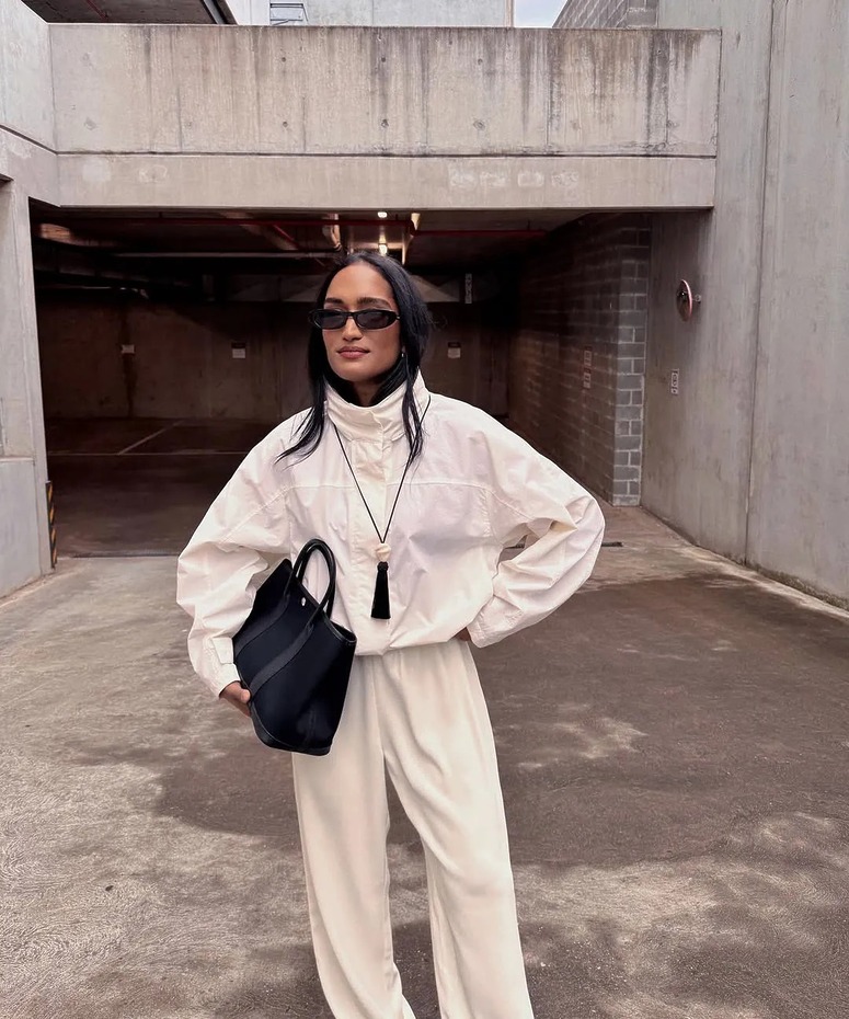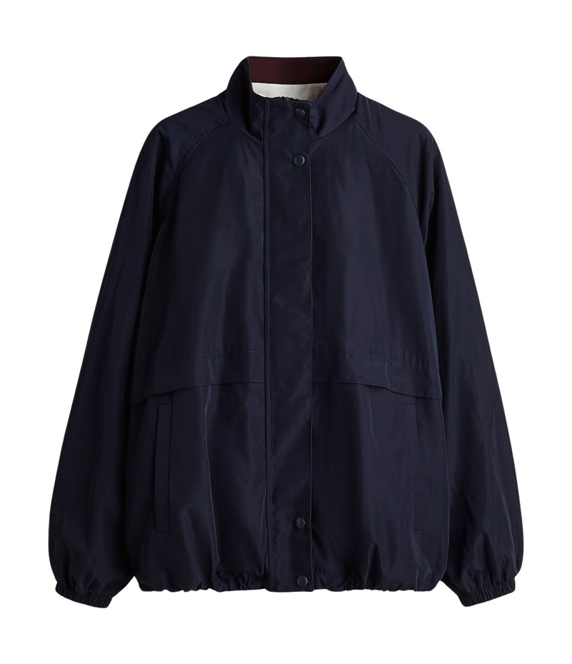 어깨는 살짝 벌룬 형태를 띠고, 구조적이면서도 부드러운 구성을 갖췄으며, 허리선에 전략적으로 잡힌 주름 덕분에 실루엣이 넉넉하지만 부해 보이지 않습니다. 세심하고 정교한 테일러링 설계가 엿보이는 디테일입니다. 더욱 흥미로운 건, 고전적인 보트넥이 아닌 깔끔한 하이넥을 적용했다는 점입니다. 추운 날 스카프를 완벽히 대체할 수 있죠. 스포티한 의류에서 차용한 이 디테일은 세련된 디자인에 실용성까지 더해줍니다.