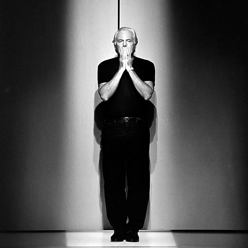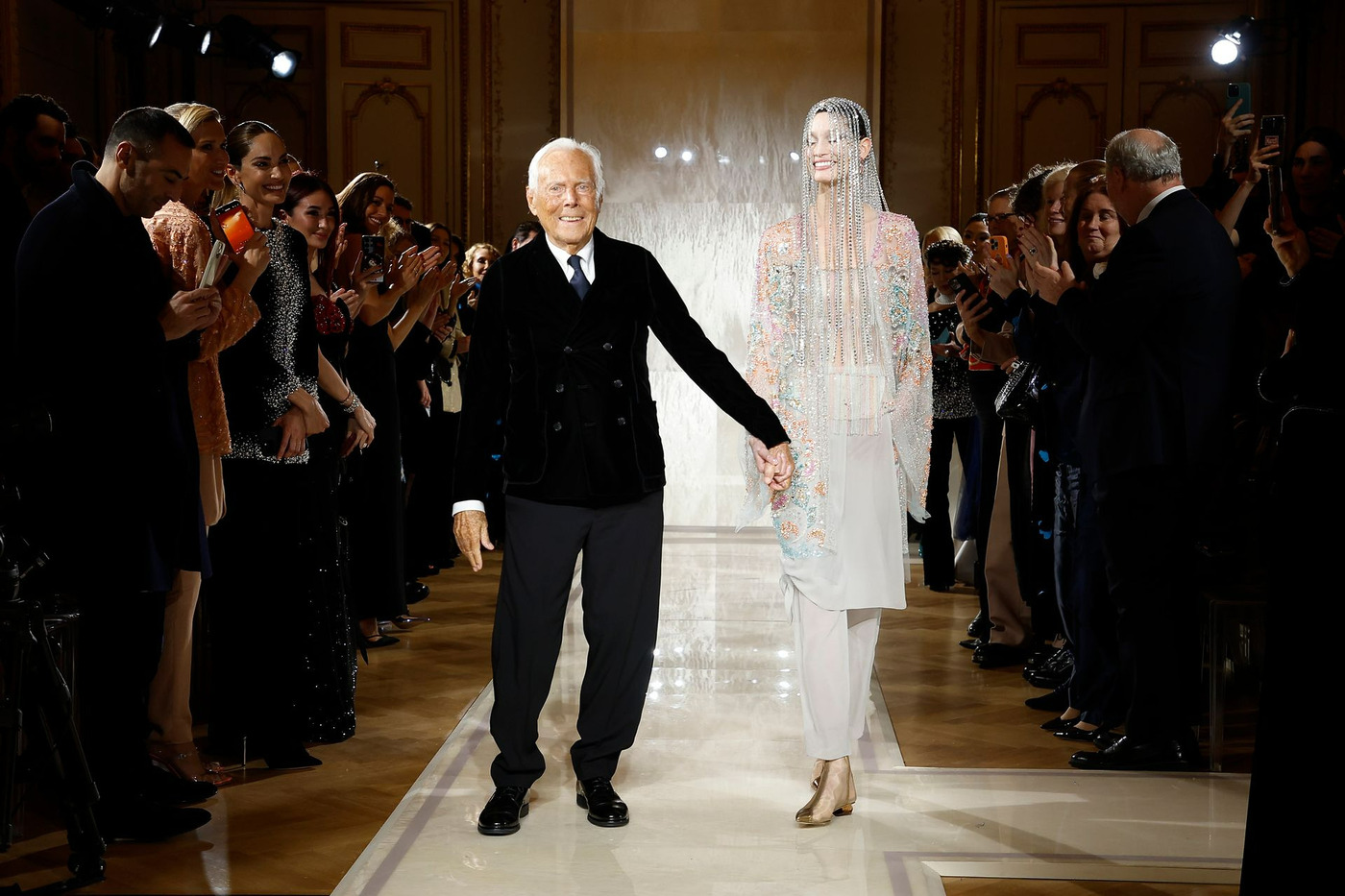 사진은 지난 2025년 1월, 아르마니 프리베 2025 봄/여름 컬렉션을 선보인 뒤 무대에 오른 조르지오 아르마니의 모습입니다. 그가 참석한 마지막 쇼가 되었습니다.