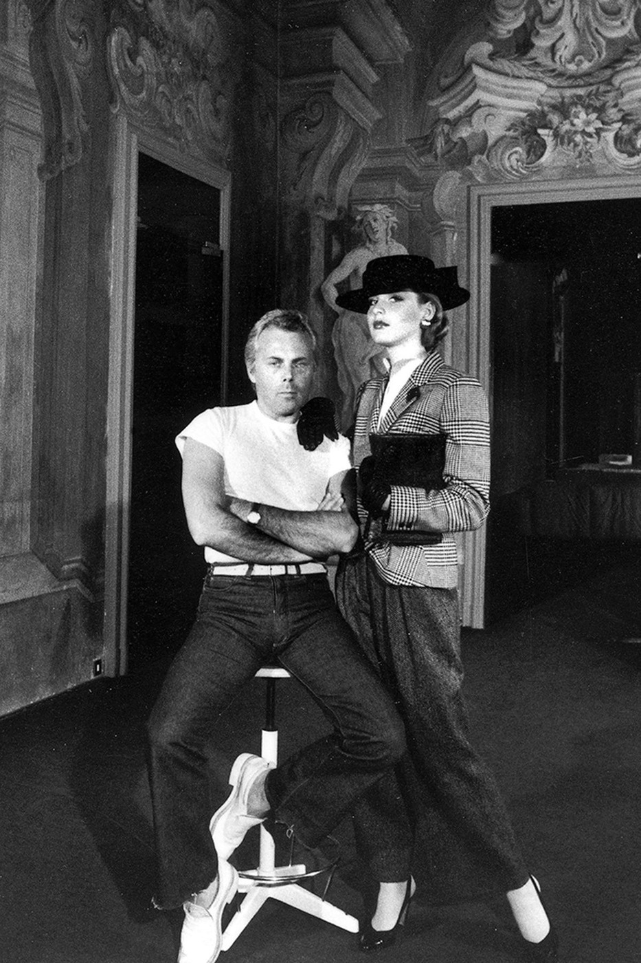 니노 세루티(Nino Cerruti)의 디자인 부서에서 일한 그는 프리랜서로 전향하고 다른 브랜드에서 일하다 1975년 자신의 이름을 딴 브랜드를 론칭했습니다. 사진은 1979년 밀라노에서 자신의 옷을 입은 모델과 함께한 조르니오 아르마니입니다.