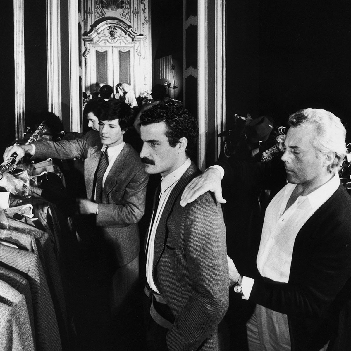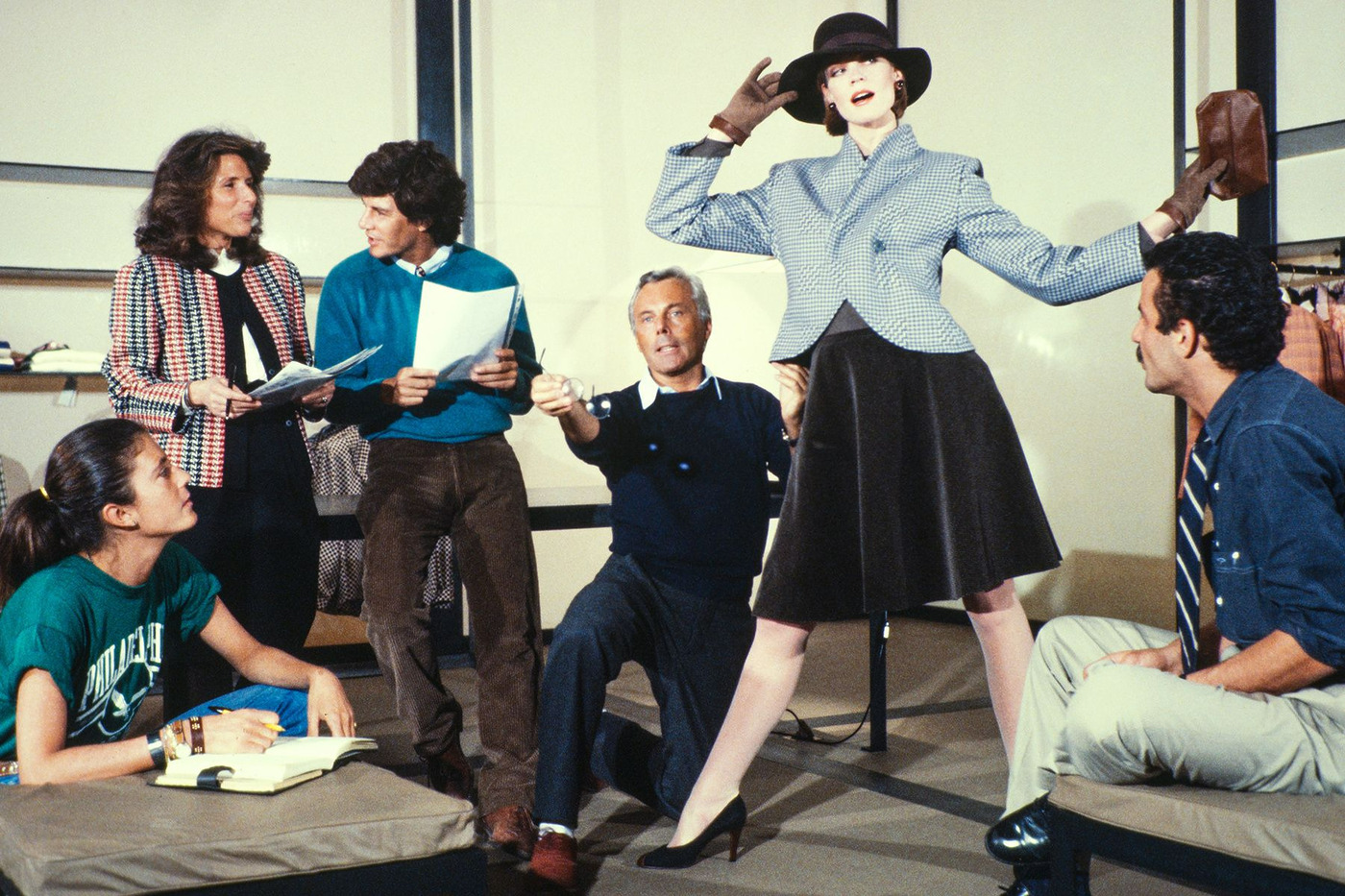 아르마니는 언제나 고전적인 요소를 현대적이고 세련되게 재해석하는 탁월한 감각을 지녔습니다. 그의 초기 성공에 큰 역할을 한 요소였죠. 그의 디자인은 오랫동안 성공한 직장인들의 스타일로 여겨졌습니다. 사진은 1983년 가을/겨울 컬렉션을 준비하는 모습.