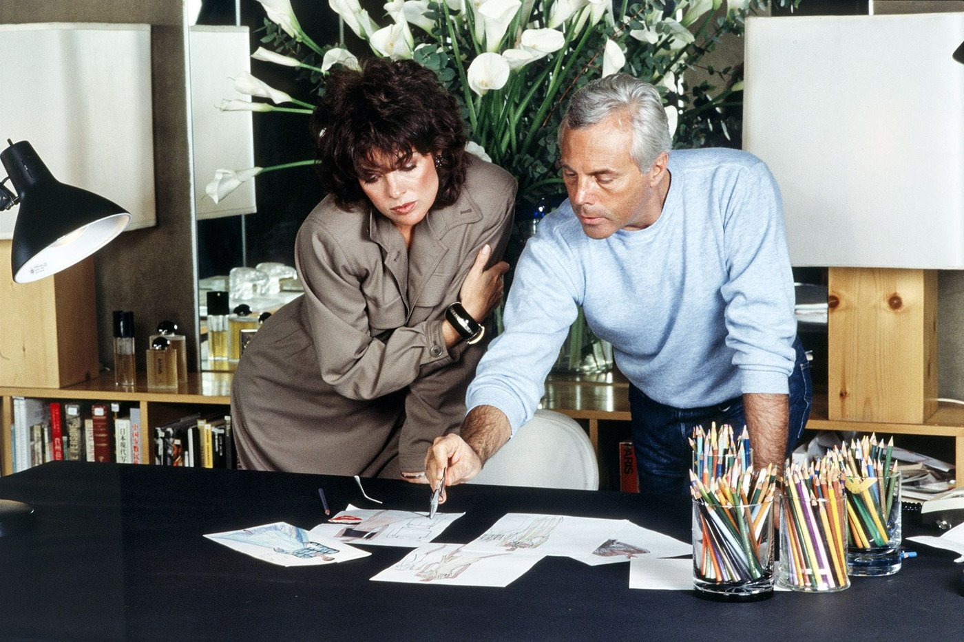 조르지오 아르마니는 오랫동안 TV와 영화계에 몸담아왔습니다. 사진은 1983년, 드라마 <댈러스(Dallas)>의 배우 린다 그레이(Linda Gray)에게 스케치를 보여주는 장면!