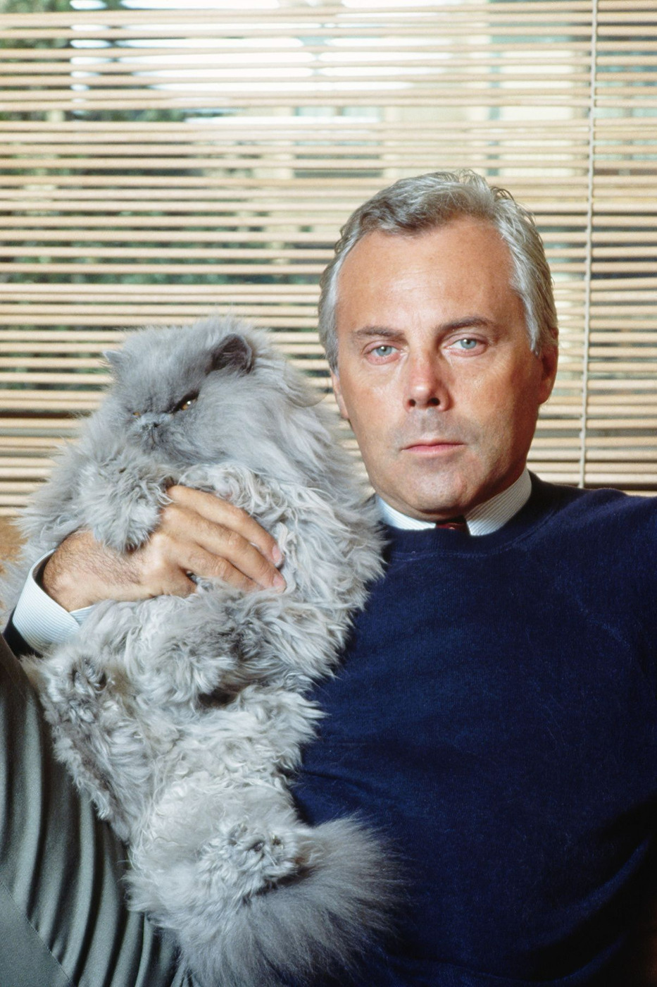 아르마니는 자신에 대해 ‘과할 정도의 완벽주의자’라고 고백했습니다. 아르마니 스타일에 대한 명확한 비전을 갖고 있었으며, 40년이 지난 지금도 그 스타일을 뚜렷하게 드러냅니다. 그의 미니멀리즘과 우아함은 브랜드를 넘어서 그를 정의하죠. 자신의 고양이와 함께 포즈를 취하고 있는 그.