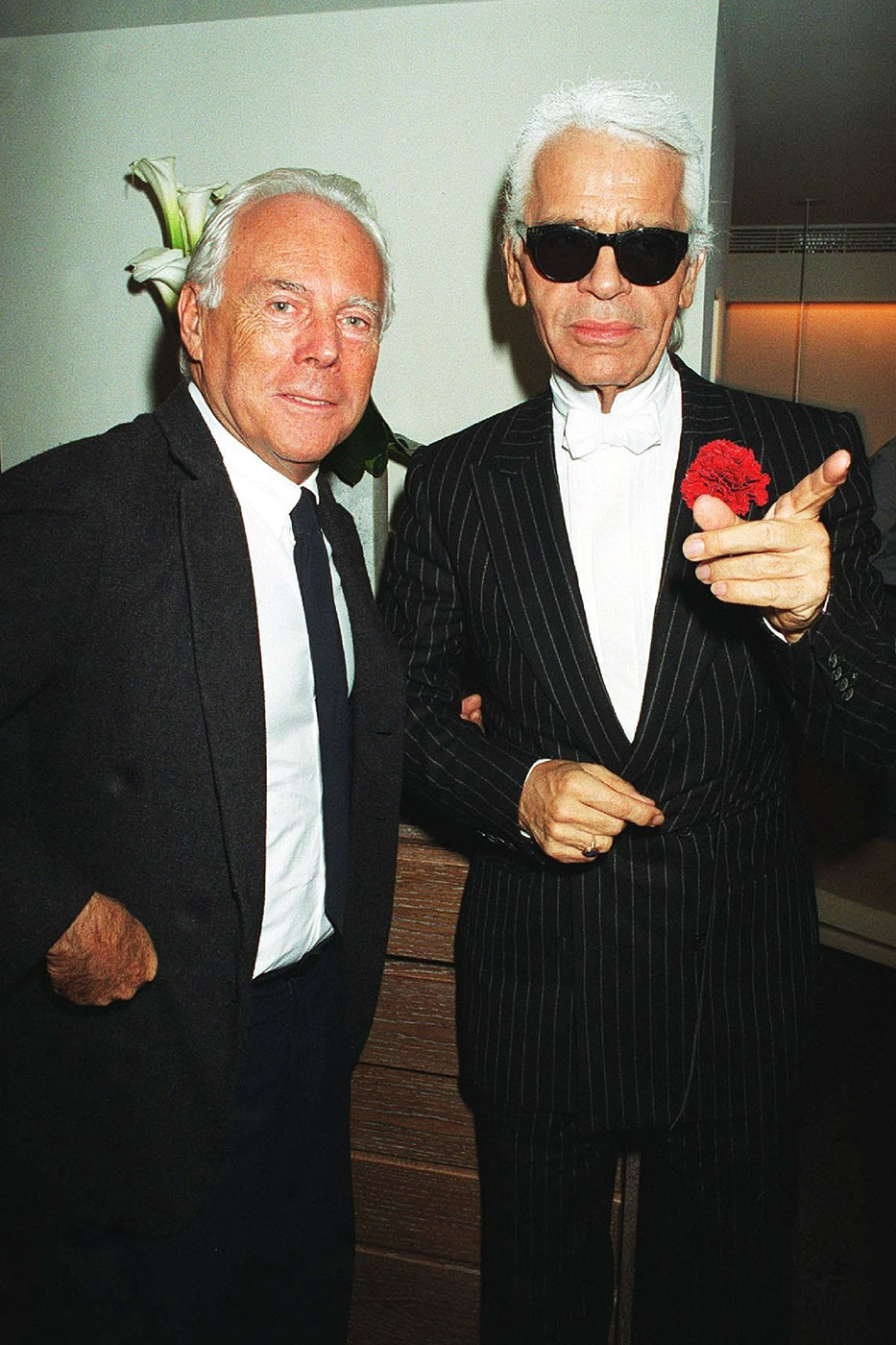 아르마니는 패션계를 장악하는 거대 패션 그룹을 벗어나 독립을 유지하는 몇 안 되는 브랜드입니다. 이 점에서 그는 코코 샤넬이나 이브 생 로랑 같은 디자이너들과 종종 비교되죠. 사진은 오랫동안 활동하며 다작을 기록한 디자이너 중 한 명인 칼 라거펠트와 함께.
