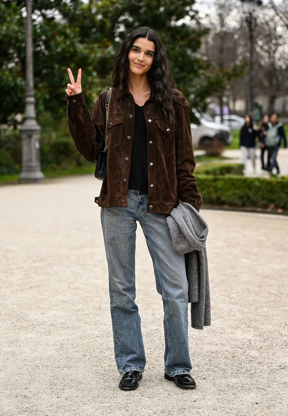 핸드백 위로 책 한 권 삐죽 튀어나오게끔 넣어두고 싶어지는 룩입니다. 스웨이드 재킷과 로퍼 조합이 주는 단정함, 티셔츠와 청바지 조합의 편안함이 어우러져 지적인 여유를 풍기죠. 티셔츠는 라운드넥보다 브이넥으로 살짝 비틀어보세요. 작은 틈을 내어 얌전하기만 한 인상을 피하는 겁니다. 놀 땐 잘 노는 우등생이 더 친해지고 싶은 법이니까요!