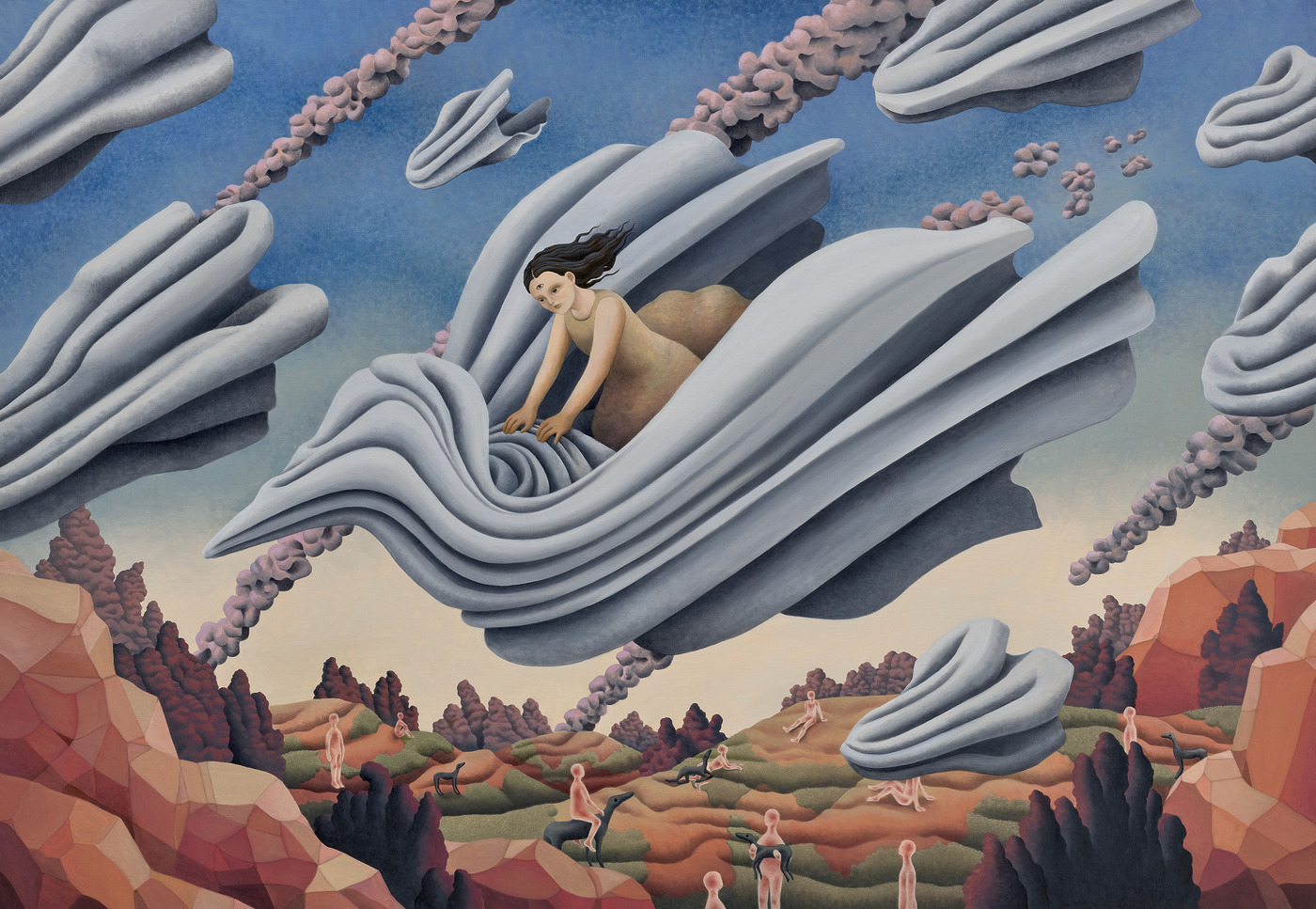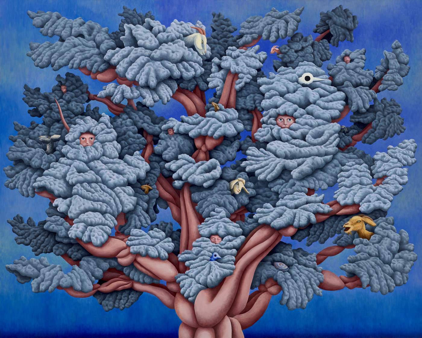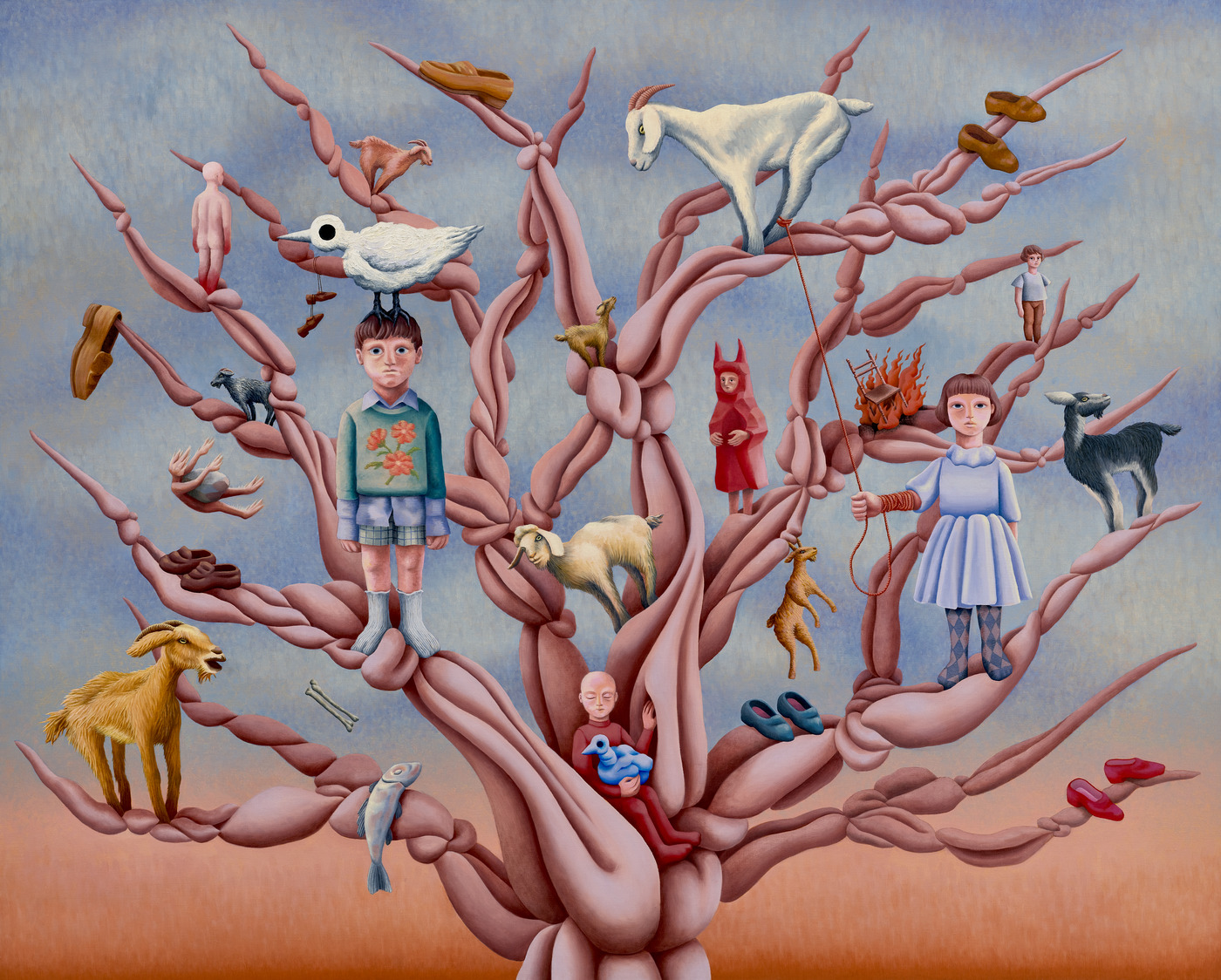 오묘한 지점을 넣고 싶었다. 모로코에 갔을 때 나무에 올라간 염소들을 봤다. 생존을 위해서였지만 관광객이 관람하니 일부러 염소를 올려놓는다. 어딘가 위태로운 풍경을 표현하고 싶기도 했다. 나는 늘 불안한 아이였고, 성인이 되어도 근원을 알 수 없는 불안감이 있었다. 그래서 불안감 속에서 균형을 찾으려 애쓰며 살아왔다. 나 말고도 그런 사람이 많을 것 같았다. 가지에 있는 사람들은 나를 비롯해 그런 존재를 표현한 것이다. 생존을 위해 나무를 타는 염소처럼.