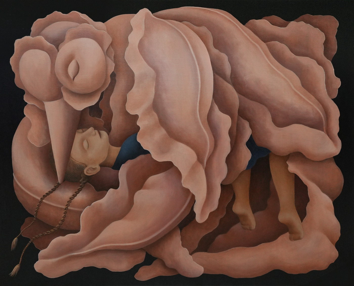 전시 초반부터 염두에 둔 주제였다. 오랜만에 하는 전시이고, 지난 전시는 심지어 학부생일 때였다. 그런 공간에서 데뷔하기엔 어렸고, 모르는 게 많던 시기였다. 이번 전시는 좀 더 아는 상태에서 하는, 진짜 데뷔전 같은 느낌이다. 그래서 나라는 작가를 소개하기에 앞서 내가 이런 기반을 지닌 사람이라고, 앞으로 선보일 작업을 관람할 때 힌트가 될 수 있는 이야기를 담았다. ‘이런 환경에서 자란 사람이구나’, ‘그래서 이런 그림을 그리는구나’ 가늠할 수 있는, 내 시스템을 파악하는 데 바탕이 될 만한 그림을 그리고 싶었다. 전시 제목도 그런 이유에서 그렇게 지었다. 유년기 정서나 경험, 환경 등 지금의 나를 만든 요소가 하나씩 쌓여 축적된 것을 상징한다. 엄마가 주된 양육자였고, 엄마가 내 어린 시절의 건축가였던 셈이다. 그런 부분을 회상하며 그렸다.