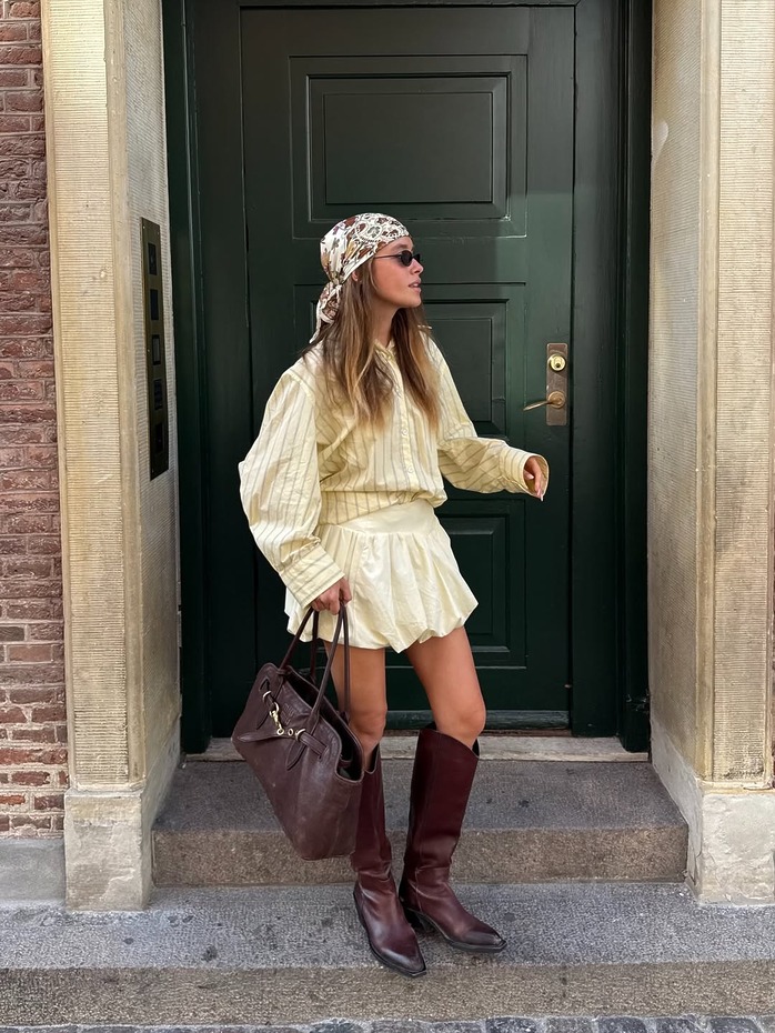 가을에 미니스커트를 입을 때 가장 확실한 해답은? 부츠와 짝을 이루는 순간입니다. 같은 스커트라도 상의가 달라지면 룩은 전혀 다른 온도를 띠죠. 옐로 셔츠와 셋업처럼 이어 붙인 첫 번째 스타일은 버건디 롱부츠, 헤어 스카프와 만나 보헤미안 무드를 뽐내고, 벌룬 슬리브 가죽 재킷을 더한 두 번째 스타일은 같은 부츠를 신고도 한층 드라마틱하게 튀어 오릅니다. 미니스커트를 꺼낼 용기가 있다면 부츠까지 반드시 장착해야 하죠.
