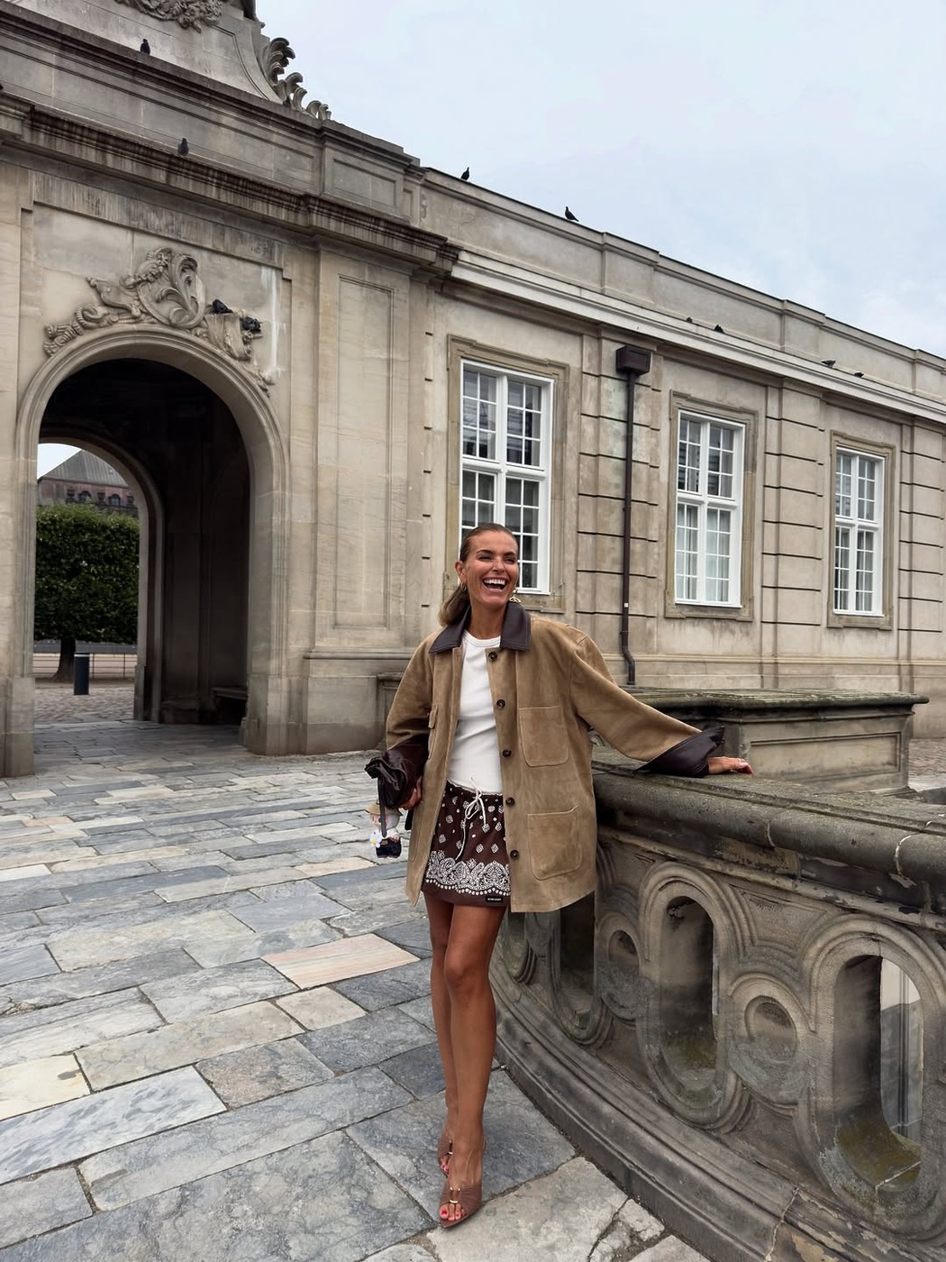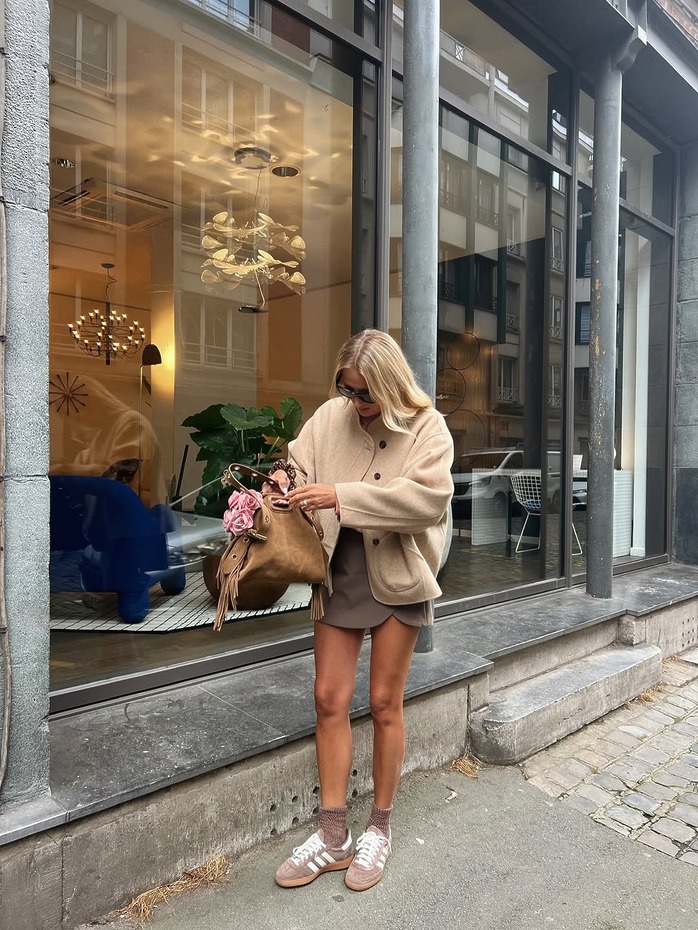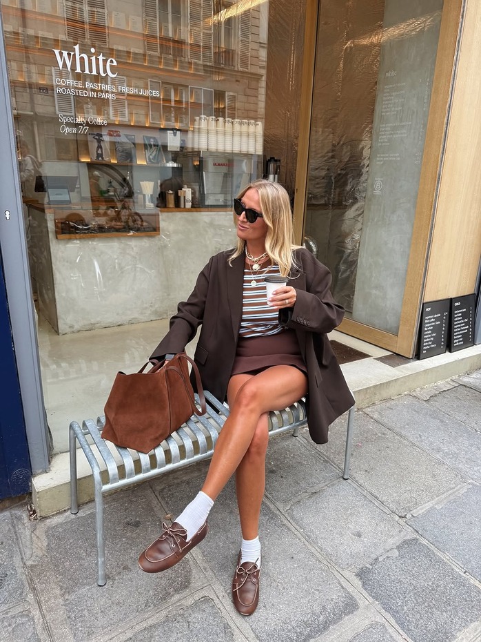 가을 미니스커트의 진짜 파트너는 따로 있습니다. 바로 브라운 아우터. 한마디로, 브라운이 곧 가을이죠. 부드러운 스웨이드 재킷은 발랄함을 잔잔하게 눌러주고, 다크 브라운 테일러드 재킷은 성숙한 무드를 씌웁니다. 미니스커트 위에 브라운 한 겹, 그게 곧 가을의 드레스코드예요. 슈즈로도 무드는 또 한 번 바뀌죠. 양말과 로퍼를 매치하면 단정한 프레피 무드가 살아나고, 스니커즈를 더하면 미니스커트의 발랄한 매력이 배가됩니다.