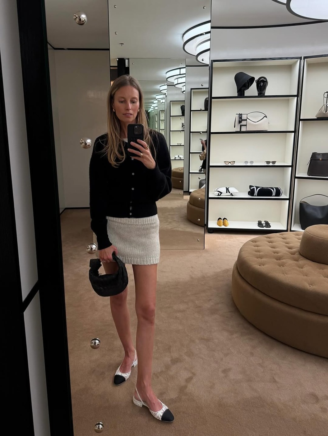 가을이라고 니트를 꼭 스웨터로만 한정할 필요는 없습니다. 니트 소재의 미니스커트는 계절감을 살리면서도 스타일링 난도를 낮춰주는 은근한 무기죠. 블랙 카디건과의 조합은 단정한 프렌치 시크를 완성하고, 컬러 블록 플랫 슈즈까지 더하니 룩은 부담 없이 고급스러워집니다. 청바지 대신 이런 니트 미니스커트 하나만 곁들여도 일상 속 가을 무드가 훨씬 세련되게 살아나요.