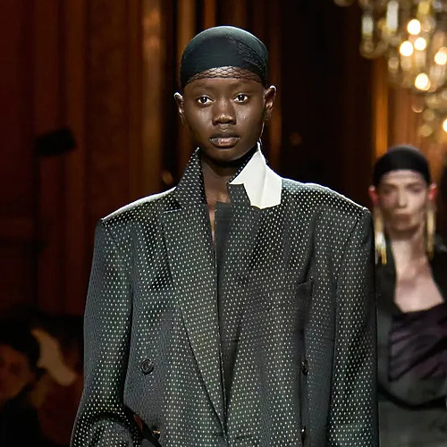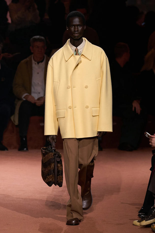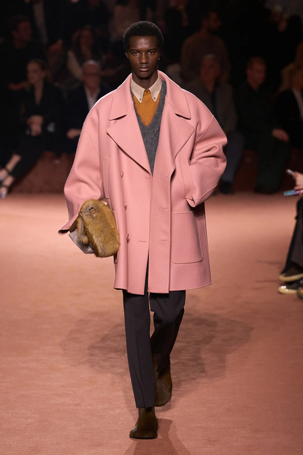 펜디는 우유를 섞은 듯한 파우더 핑크 컬러의 코트를 선보였습니다. 은은한 색감 덕분에 더욱 현실적으로 느껴졌죠. 회색과의 조합이 훌륭하다는 점도 확인할 수 있었습니다. 펜디의 룩을 참고해 회색 니트나 수트 팬츠에 파우더 핑크 컬러 코트를 걸쳐보세요.