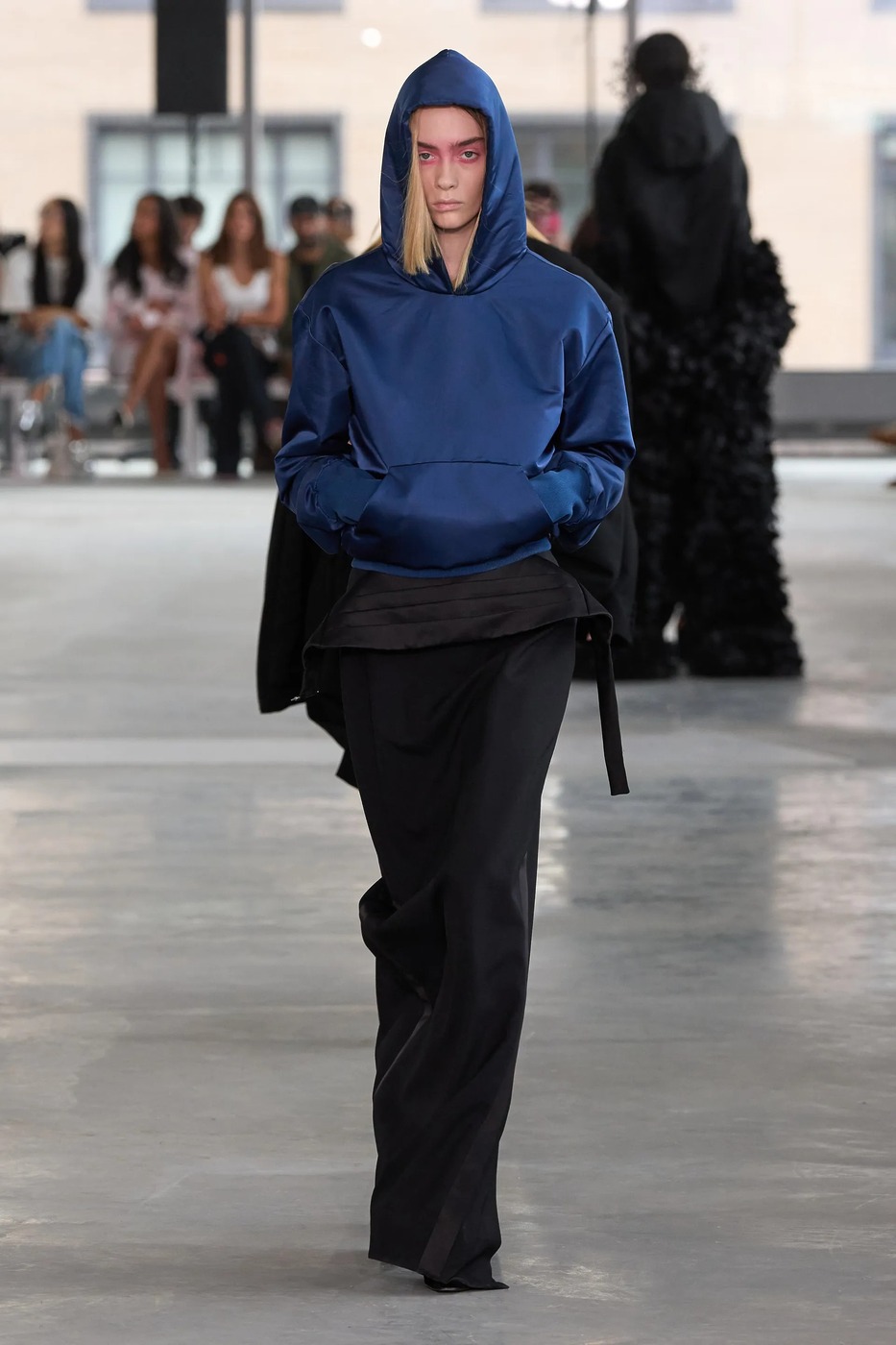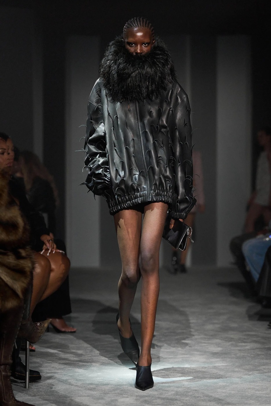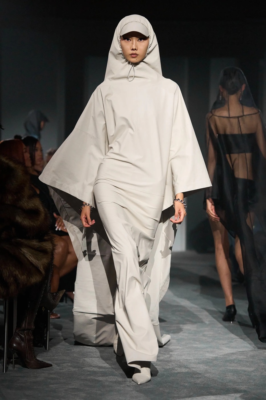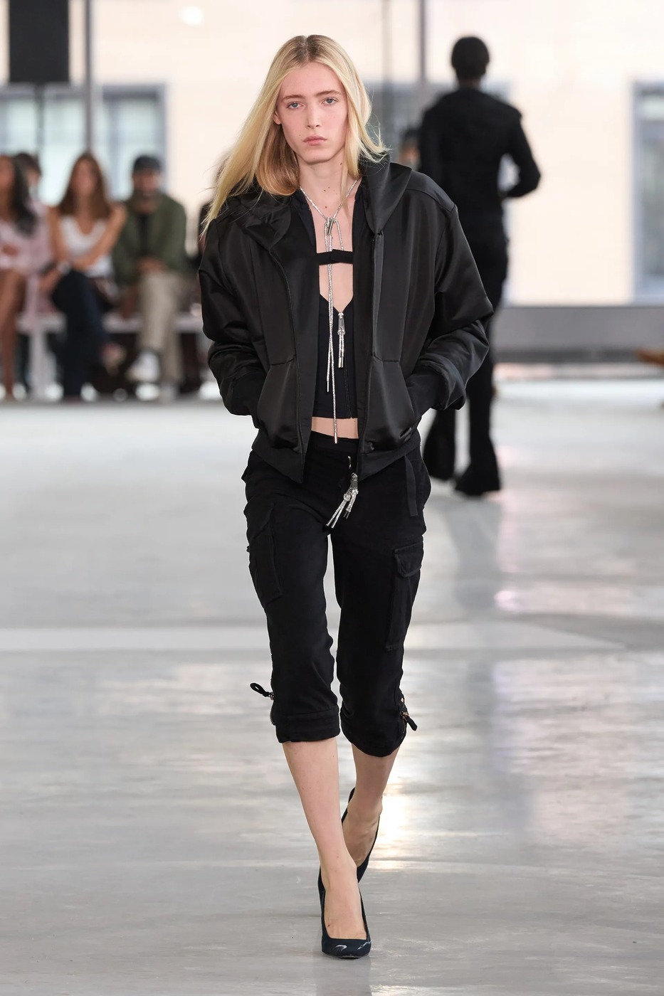 피오트레크 판시치크(Piotrek Panszczyk)가 떠난 자리를 니콜라스 애번이 채웁니다. 발렌시아가 꾸뛰르 스튜디오에서 일했던 그는 새로운 크리에이티브 디렉터로 데뷔하며 기대감을 높였습니다. 그는 “밤에 외출할 때 ‘오늘 밤엔 무슨 일이든 일어날 수 있어’라는 느낌을 많이 고려했어요”라며 “아침에도 그런 기분을 느낄 수 있다면 멋질 거예요”라고 덧붙였죠. 실제로 쇼는 오전 10시 29분에 시작되었고요. <보그 런웨이>의 시니어 패션 에디터 라이아 가르시아 푸르타도는 첫 룩에서 애번이 말한 그 느낌을 받았다고 얘기했습니다. 슬림한 면 스웨트셔츠에 탱크 톱, 그것도 목걸이처럼 보일 정도로 아주 긴 지퍼가 달린 탱크 톱이었죠. 거기에 크롭트 카고 팬츠까지. 블랙 일색의 룩에선 ‘아무 일도 일어나지 않는다면, 내가 만들어내겠다’는 각오도 엿보였죠.