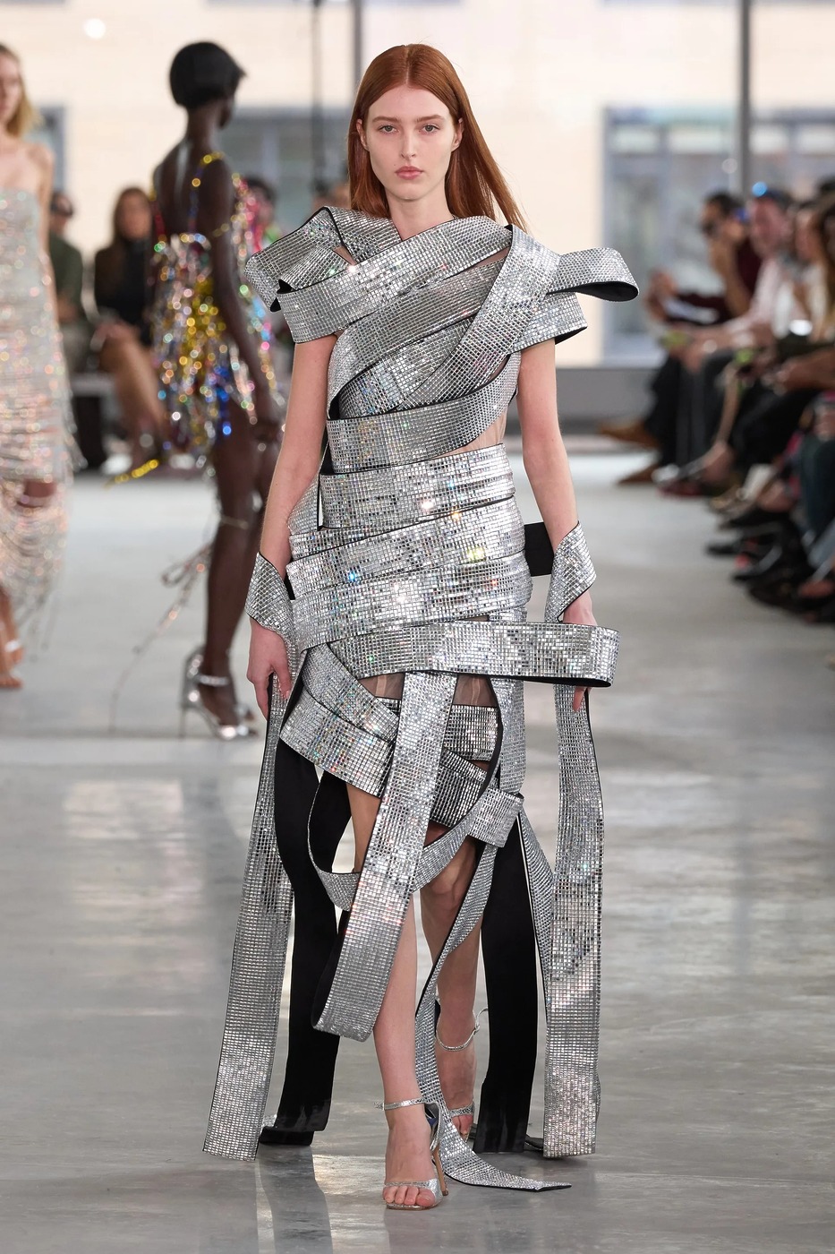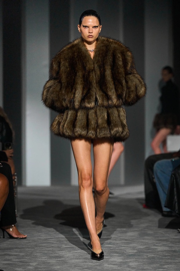 곡선이 돋보이는 몰딩의 재킷, 가슴을 감싸는 셔츠와 초미니스커트, 가짜 모피와 엘리자베스 1세 여왕처럼 목을 감싸는 부풀린 칼라까지, 여성적이면서도 권위적이었죠. 또한 기술 접목에 일가견이 있는 알렉산더 왕답게 3D 프린터를 활용해 트레드 솔의 키튼 힐이 달린 뮬을 선보였습니다.