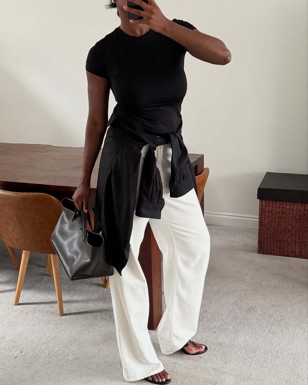 세심한 컬러 매치 덕분에 룩이 어색해 보이지도 않았습니다. 톱과 팬츠는 물론 카디건과 액세서리까지 철저하게 화이트와 블랙을 고집했기 때문이었죠. 미니멀한 분위기를 내고 싶다면 클래식한 컬러를 활용하고, 위트를 드러내고 싶다면 화려한 컬러나 패턴이 적용된 카디건을 허리에 묶는 것도 고려해볼 수 있습니다.