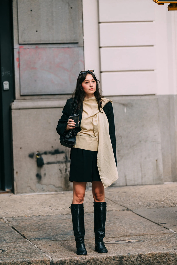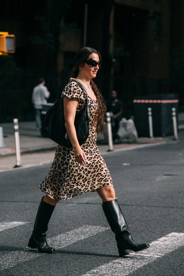 오늘의 주인공, 승마 부츠입니다. 무릎 바로 밑까지 올곧게 뻗은 디자인, 그리고 얇은 밑창이 특징이죠. ‘귀족 스포츠’로 불리는 승마 신발에서 영감받아 완성한 만큼 고풍스러운 분위기를 자아냅니다. 색깔 역시 블랙이나 브라운, 버건디처럼 클래식한 경우가 대부분이고요. 이틀 전까지만 해도 패션 위크가 한창이었던 뉴욕의 거리에서도 어렵지 않게 승마 부츠를 찾아볼 수 있었는데요. 지루하다는 특성을 십분 활용해, 역설적으로 지루하지 않은 룩을 완성하는 센스가 눈에 띄었습니다. 레더 미니 드레스나 레오파드 패턴 드레스의 강렬한 존재감을 중화한 룩처럼 말이죠.