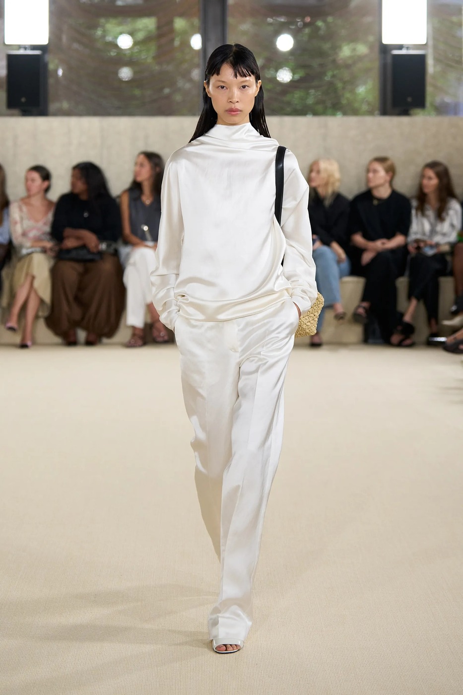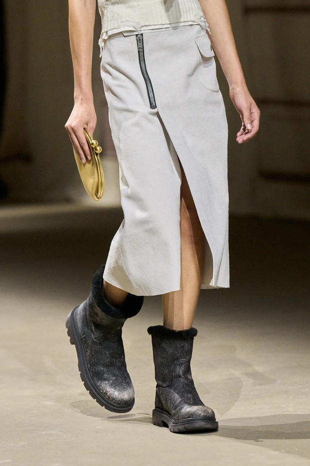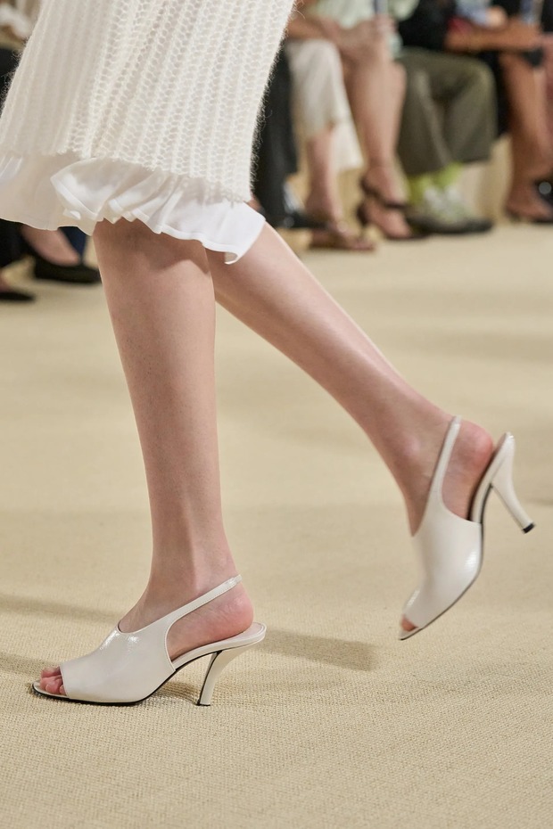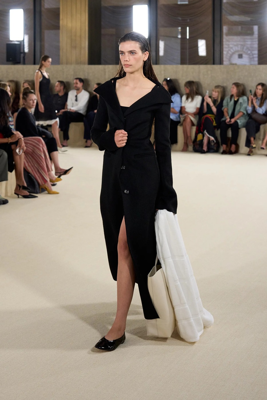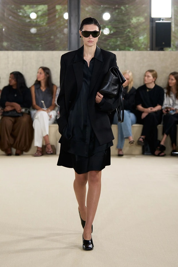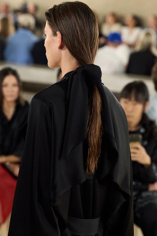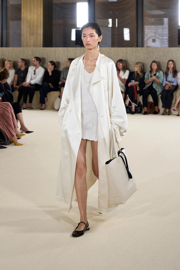 토템은 새봄을 위해 ‘완벽하지 않은 아름다움’을 노래했습니다. 엘린 클링은 “날것 그대로, 눈에 보이는 자연스러운 질감을 담아냈다”고 말했습니다. 실제로 모델들의 머리는 완전히 말리지 않은 느낌으로 느슨하게 뒤로 묶었고, 가방(클립이라는 신제품!)은 잠금장치가 풀린 채였으며, 일부는 급히 집을 나선 듯 코트를 움켜쥐고 있었습니다. 깔끔하게 마감하지 않은 끝단, 주름진 소재, 워싱 처리한 가죽은 오래 입은 듯한 느낌을 주었죠. 과거 토템이 추구하던 각 잡힌 블랙의 베일 듯한 테일러링이 인스타그램 속 세상이었다면, 이번 2026 봄/여름 룩은 케이티 홈즈의 스트리트 룩처럼 현실에 맞닿아 있었죠. 물론 컬러는 여전히 블랙과 화이트였지만요. 보송보송한 실과 금속 소재, 광택 유무로 룩의 표면에 재미를 더했죠. 쇼를 마무리한 미사보 스타일의 레이스 장식 망토는 예상치 못한 로맨틱함을 더했습니다. 디자이너 듀오는 조부모님의 식탁보에서 영감을 받았다고 설명했고요. “개인적 요소와 현실에 뿌리내린 무언가를 좋아한다”라고 한 클링의 말 그대로였죠. 어린 시절 식탁보를 어깨에 둘러봤던 이들이라면 공감할 만한 이야기였습니다. 어디까지가 자연스러움인지 모르겠지만, 토템이 예쁜 건 알겠네요.