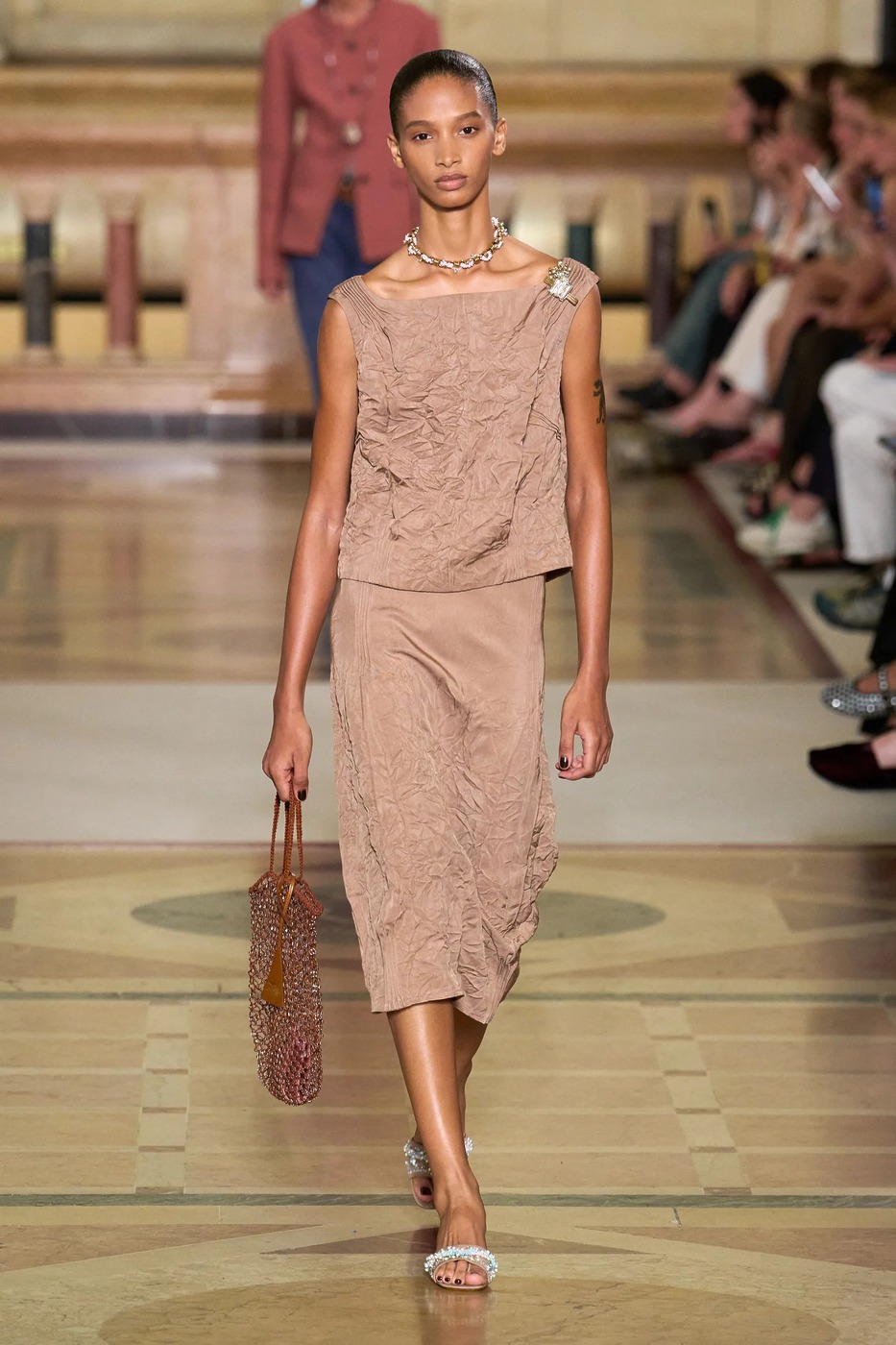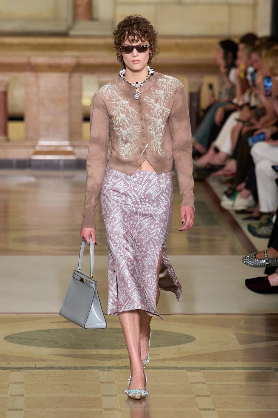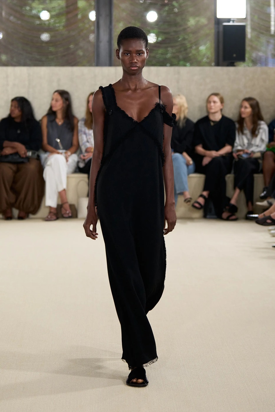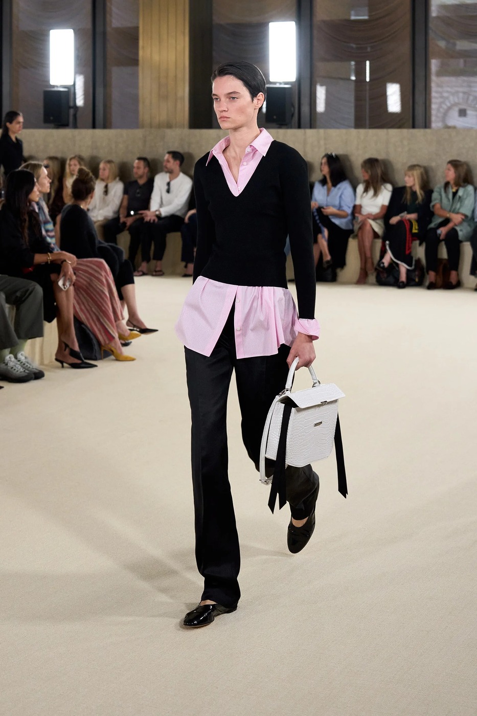 토템은 새봄을 위해 ‘완벽하지 않은 아름다움’을 노래했습니다. 엘린 클링은 “날것 그대로, 눈에 보이는 자연스러운 질감을 담아냈다”고 말했습니다. 실제로 모델들의 머리는 완전히 말리지 않은 느낌으로 느슨하게 뒤로 묶었고, 가방(클립이라는 신제품!)은 잠금장치가 풀린 채였으며, 일부는 급히 집을 나선 듯 코트를 움켜쥐고 있었습니다. 깔끔하게 마감하지 않은 끝단, 주름진 소재, 워싱 처리한 가죽은 오래 입은 듯한 느낌을 주었죠. 과거 토템이 추구하던 각 잡힌 블랙의 베일 듯한 테일러링이 인스타그램 속 세상이었다면, 이번 2026 봄/여름 룩은 케이티 홈즈의 스트리트 룩처럼 현실에 맞닿아 있었죠. 물론 컬러는 여전히 블랙과 화이트였지만요. 보송보송한 실과 금속 소재, 광택 유무로 룩의 표면에 재미를 더했죠. 쇼를 마무리한 미사보 스타일의 레이스 장식 망토는 예상치 못한 로맨틱함을 더했습니다. 디자이너 듀오는 조부모님의 식탁보에서 영감을 받았다고 설명했고요. “개인적 요소와 현실에 뿌리내린 무언가를 좋아한다”라고 한 클링의 말 그대로였죠. 어린 시절 식탁보를 어깨에 둘러봤던 이들이라면 공감할 만한 이야기였습니다. 어디까지가 자연스러움인지 모르겠지만, 토템이 예쁜 건 알겠네요.