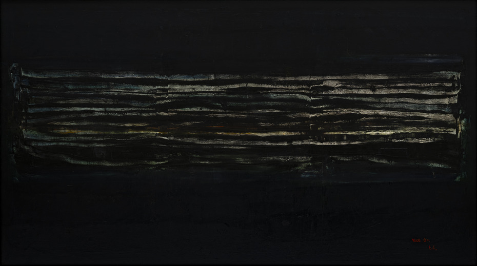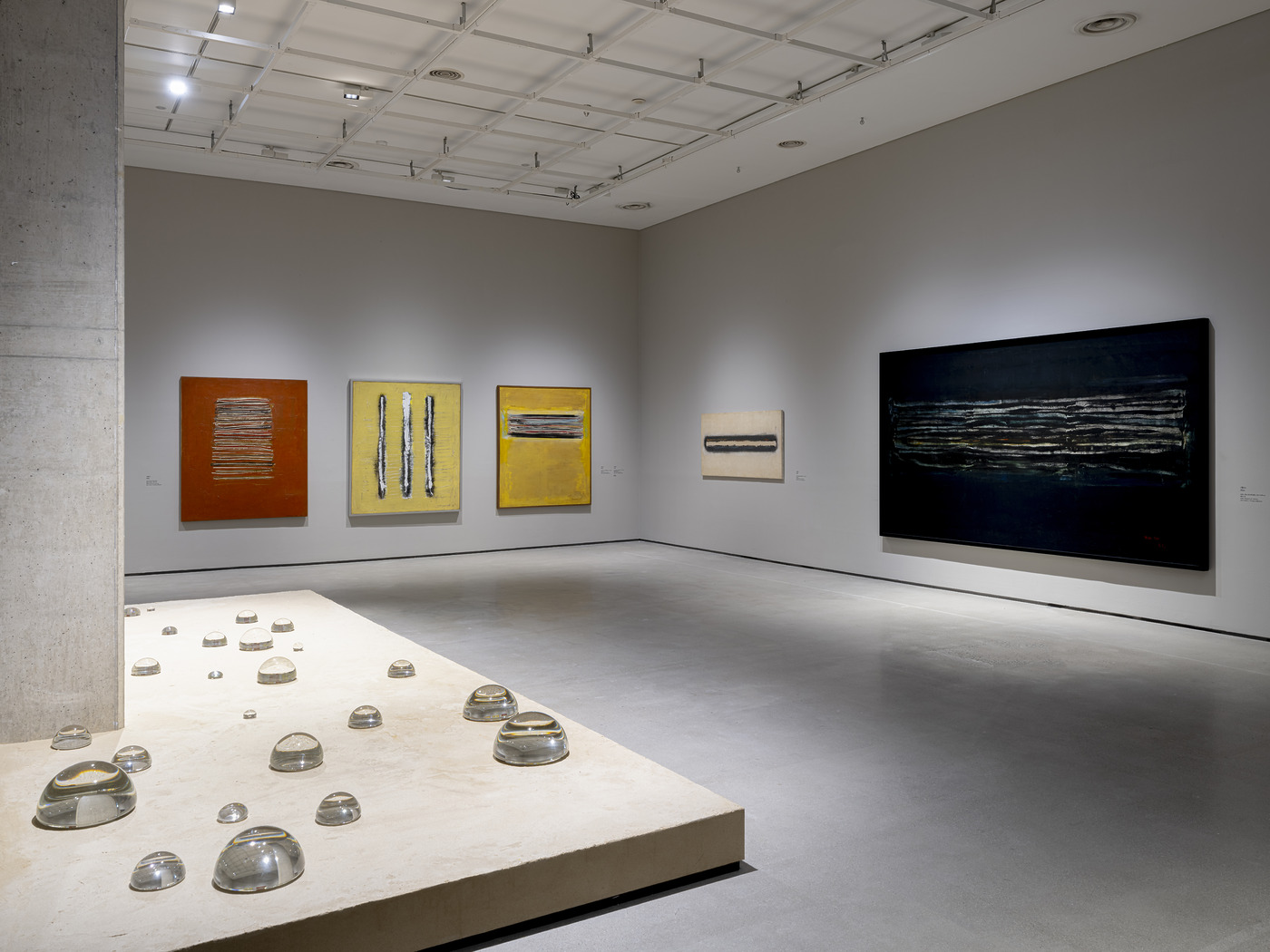회고전임을 내세운 이번 전시가 김창열의 작업 세계를 망라한다는 사실도, 저 같은 미술 애호가를 매료시킨 부분 중 하나입니다. 전쟁의 상처를 화면에 각인시키며 죽음을 위로하는 듯 제의를 표한 1950년대 후반의 앵포르멜 시기, 1960년대 뉴욕에서 시도한 신체와 물질 사이 기하 추상의 시기, 인체의 점액질을 연상시키는 유기적인 형상을 그려내던 1960년대 말 파리 정착 직후의 시기, 젖은 캔버스에 맺힌 물방울을 우연히 발견한 후 물방울 그리기에 매진한 시기, 그리고 어렸을 적 할아버지께 배웠던 천자문 같은 문자를 작품에 도입해 세상의 이치와 질서를 알고자 한 생애 후반 작업에 이르기까지… 김창열의 전 생애를 가로지르는 다채로운 작품들을 만나다 보면 예술 너머의 삶을 실감하게 됩니다.