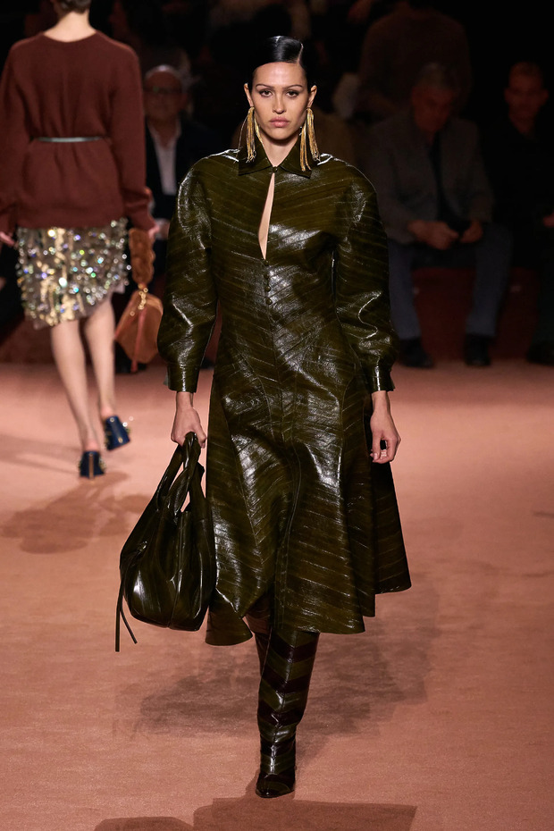 위에 아무것도 걸치지 않은 채, 단독으로 착용할 때 빛을 발하는 레더 드레스도 빼놓을 수 없습니다. 펜디는 볼륨감 넘치는 어깨 라인이 돋보이는 드레스를, 케이트는 슬리브리스 디자인을 제안했는데요. 롱부츠나 타이츠를 활용해 다소 허전해 보이는 다리를 가리는 스타일링도 참고할 만합니다.