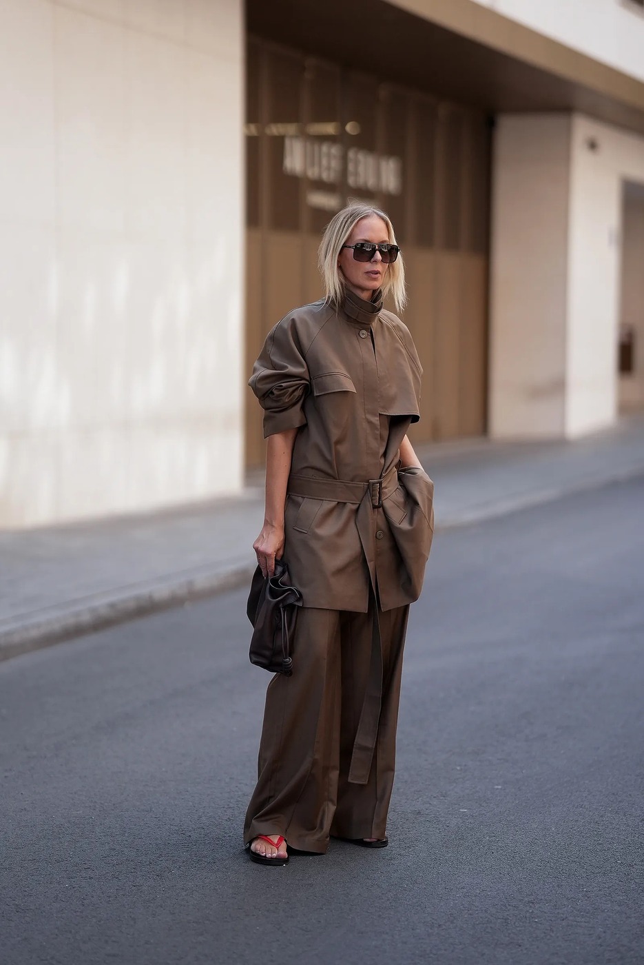 클래식은 절대 실패하지 않습니다. 옷차림에 재미를 더하는 건 언제나 텍스처와 디테일이죠. 전문가처럼 매치하는 것이 목표라면 루스한 브라운 팬츠에 벨트가 달린 가벼운 하이넥 재킷을 매치하세요!(하이넥 재킷은 2026 봄/여름 뉴욕 패션 위크를 강타했습니다.) 레드 스트랩 샌들을 포인트로 더하면 역동적이면서도 감각적인 룩이 되죠.