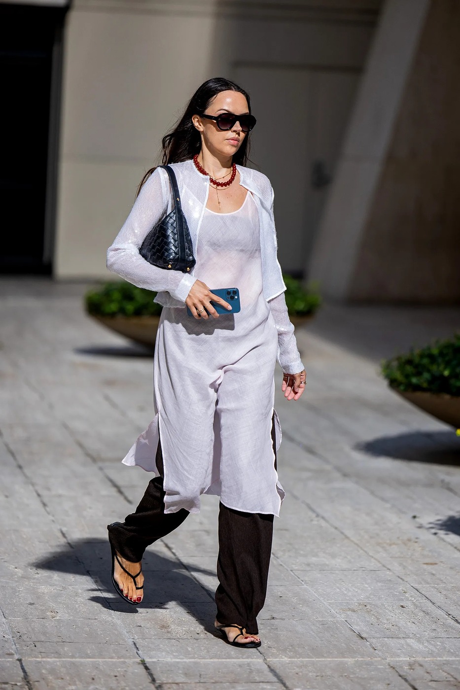 아이스 블루와 레드 외에도 클래식한 블랙은 브라운과 잘 어울립니다. 2000년대 무드를 소환하듯 화이트 리넨 드레스를 브라운 팬츠 위에 겹쳐 입고, 블랙 토 샌들 혹은 블랙 플립플롭으로 마무리해보세요. 미니멀하면서도 환절기 룩으로 제격입니다.
