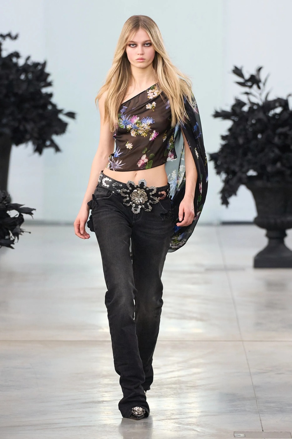 블루마린은 플로럴 프린트가 돋보이는 원 숄더 블라우스를 매치했습니다. 여름에서 가을로 자연스럽게 이어질 수 있는 유연한 룩이죠. 다만 이 룩에서는 여름 분위기보다 빈티지 혹은 세컨드 핸드 감성을 부여하는 장치로 쓰였습니다. 요즘 가장 유행하는 통이 좁은 플레어 진에 메탈 버클이 달린 에나멜 펌프스를 더하면 더욱 스타일리시한 분위기를 연출할 수 있죠. 포인트는 XXL 사이즈의 플라워 벨트지만요. 2025년식 보헤미안 룩을 즐겨보세요.