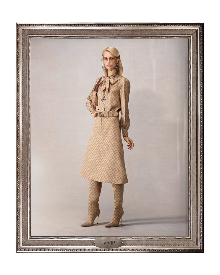 이 컬렉션에는 무심한 듯 보이지만 이탈리아 특유의 우아함과 세련됨이 스며 있는 스프레차투라(Sprezzatura) 무드가 녹아 있습니다. 청키한 힐이 달린 홀스빗 펌프스, 퀼팅 드레스, 1970년대 스타일 푸시 보 드레스, 악어 무늬 미니스커트, 올 블랙 팬츠 수트, 실크 블라우스 등 흥미로운 룩으로 가득합니다. 뎀나는 이번 컬렉션을 통해 구찌의 시그니처 아이콘인 뱀부 백, 홀스빗 로퍼, 플로라 모티브, 창립자 구찌오 구찌의 이니셜을 상징하는 GG 모노그램 등을 현대적 미학에 맞게 재해석해 새롭게 선보입니다.