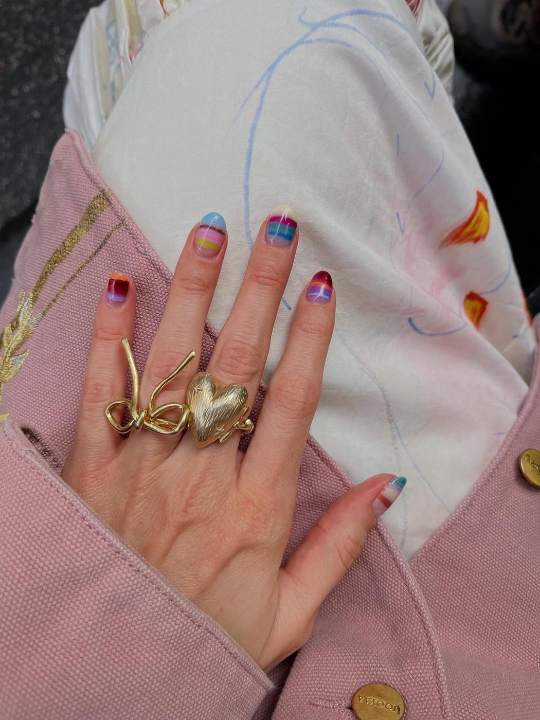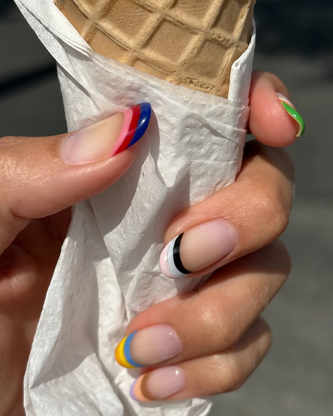 카일리처럼 모노톤 스트라이프도 멋지지만, 요즘 SNS에서는 알록달록한 컬러 플레이가 가장 뜨거운 반응을 얻고 있습니다. 세 가지 이상 컬러를 손톱마다 다르게 매치하면 보는 것만으로도 기분이 경쾌해지죠.