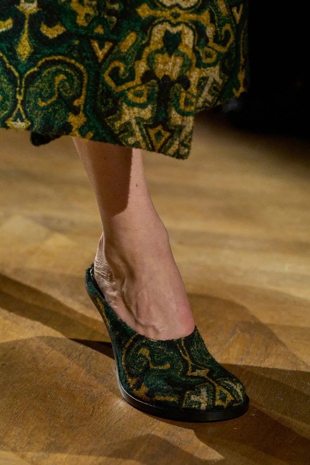 이 신발은 독특한 디자인에서 아름다움을 찾는 패션 애호가들을 위한 것입니다. 여성적 실루엣으로 여기는 뾰족한 앞코의 힐을 버리고, 발굽처럼 둥그스름하게 커팅한 것이 특징이죠. 드리스 반 노튼은 태피스트리 같은 에스닉한 패턴으로 추운 계절의 보헤미안 스타일을 정의했습니다.