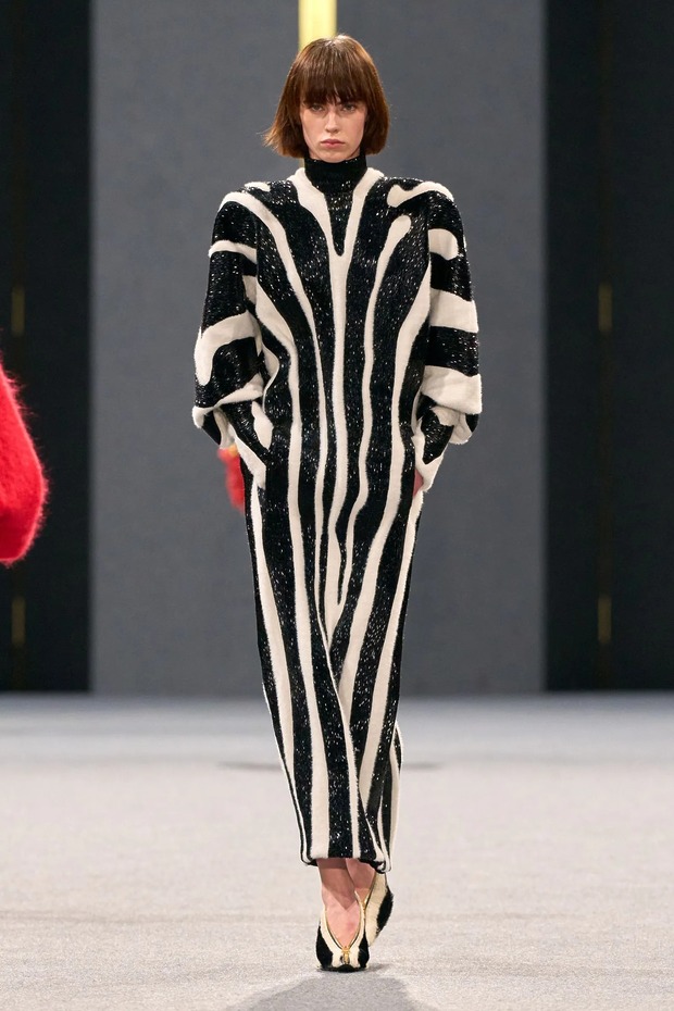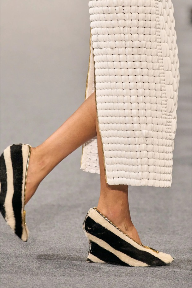 발망은 곡선형 힐, 인조가죽의 질감, 그리고 얼룩말 프린트가 특징인 웨지 슈즈를 제시했습니다. 발망의 룩처럼 셋업에 어울리는 것은 물론이고, 흰색 스커트나 테일러드 팬츠에 개성을 더하는 마무리로 완벽합니다. 게다가 신발 전체에 깔린 지퍼 디테일과 앞코의 지퍼 머리는 신발을 열고 발을 넣은 듯한 모양새로 재미를 주죠. 이 웨지 힐을 신으면 별도의 액세서리 없이도 일상에서 벗어난 특별한 순간을 만끽할 수 있습니다.