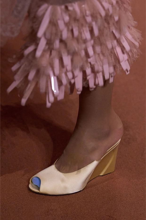 겉으로는 평범한 핍 토 슈즈처럼 보입니다. 하지만 빼꼼 드러난 파란 발가락의 정체가 매우 의심스럽죠. 펜디는 클래식한 디자인의 핍 토 웨지 슈즈를 선보였습니다. 실크로 감아 부드럽고 우아한 느낌을 내죠. ‘못생긴 신발’의 카테고리 안에 넣기에는 의아하다는 생각이 들 만큼요. 하지만 발가락만 덮은 블루 톤 양말이 이 신발의 모든 걸 바꿔놓죠. 흰 블라우스에 청바지, 혹은 가죽 셔츠 드레스에 매치해도 훌륭합니다. 결국, 룩 전체를 변모시키는 디테일이 되니까요.