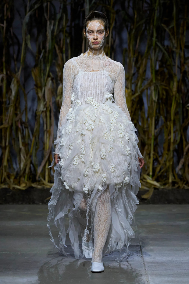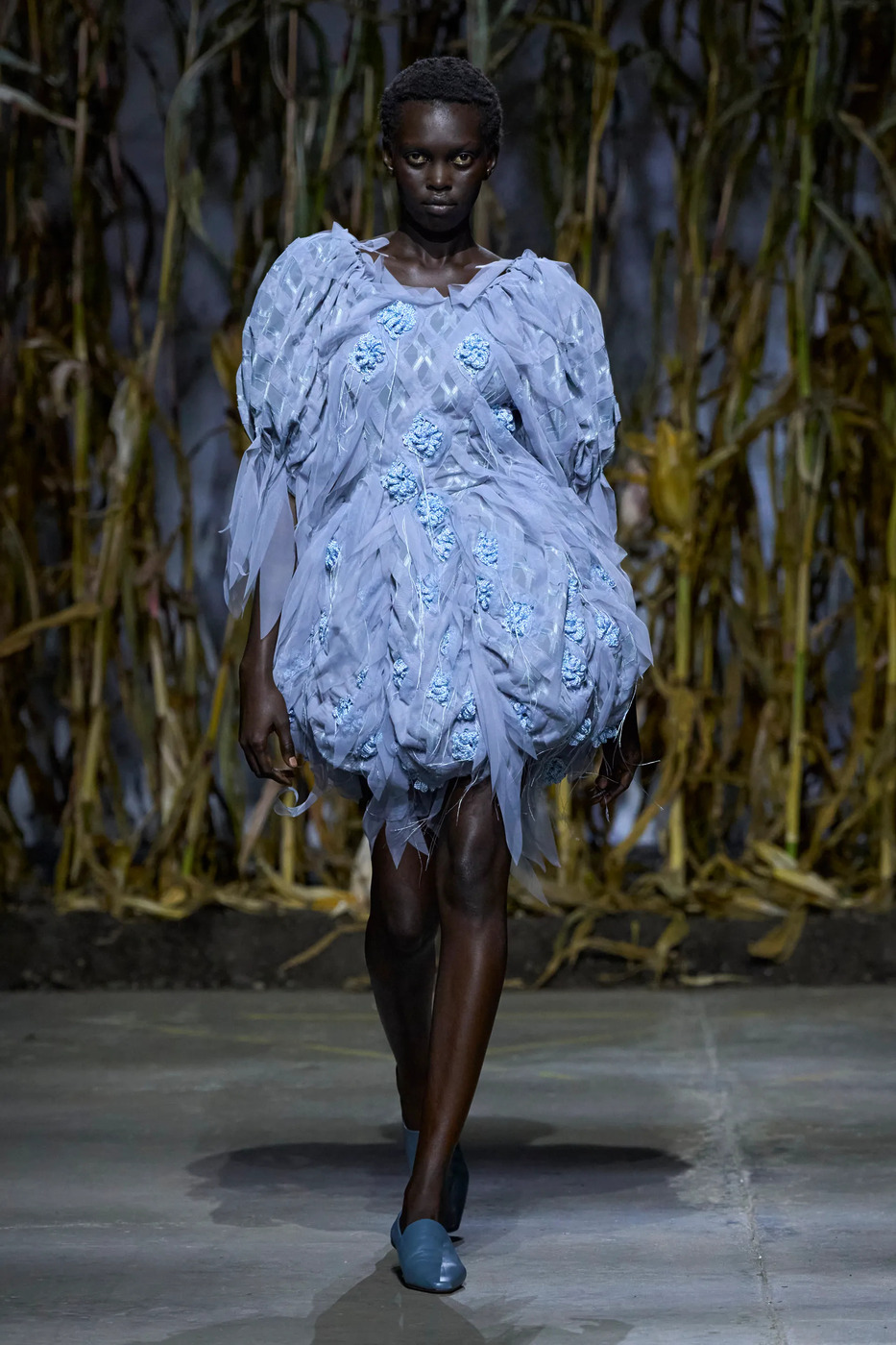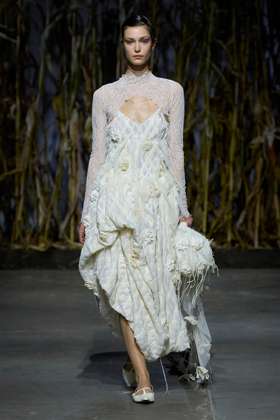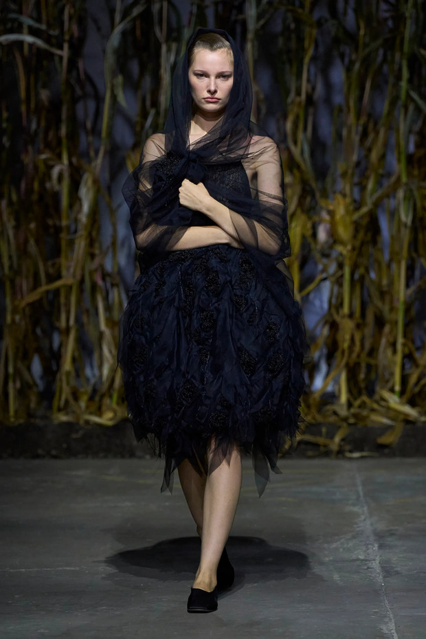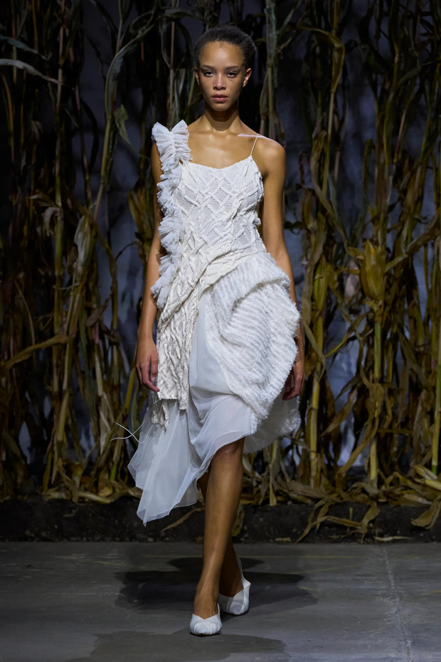 파울린 두얀코트는 이번에도 자신이 가장 잘하는 것에 집중했습니다. 전부 수작업으로 완성해, 보드라운 촉감과 가벼운 무게를 자랑하는 니트웨어가 반복적으로 등장했죠. 동시에 브랜드를 하나의 틀에 가두지 않고, 모든 가능성을 열어두겠다는 의지를 읽을 수도 있었습니다. 지난 컬렉션과 달리 아이템의 가짓수가 훨씬 다양해졌거든요. 스파게티 스트랩 드레스와 퍼프 숄더 드레스는 일상생활에서도 충분히 입을 수 있을 것으로 보였습니다. 아가일 패턴과 크로셰 공법을 자신만의 방식으로 재해석한 피스들도 눈에 띄었고요. 다양한 변주를 시도하면서도, 브랜드의 정체성인 ‘섬세한 여성성’을 잃지 않은 점이 특히 인상적이었습니다.