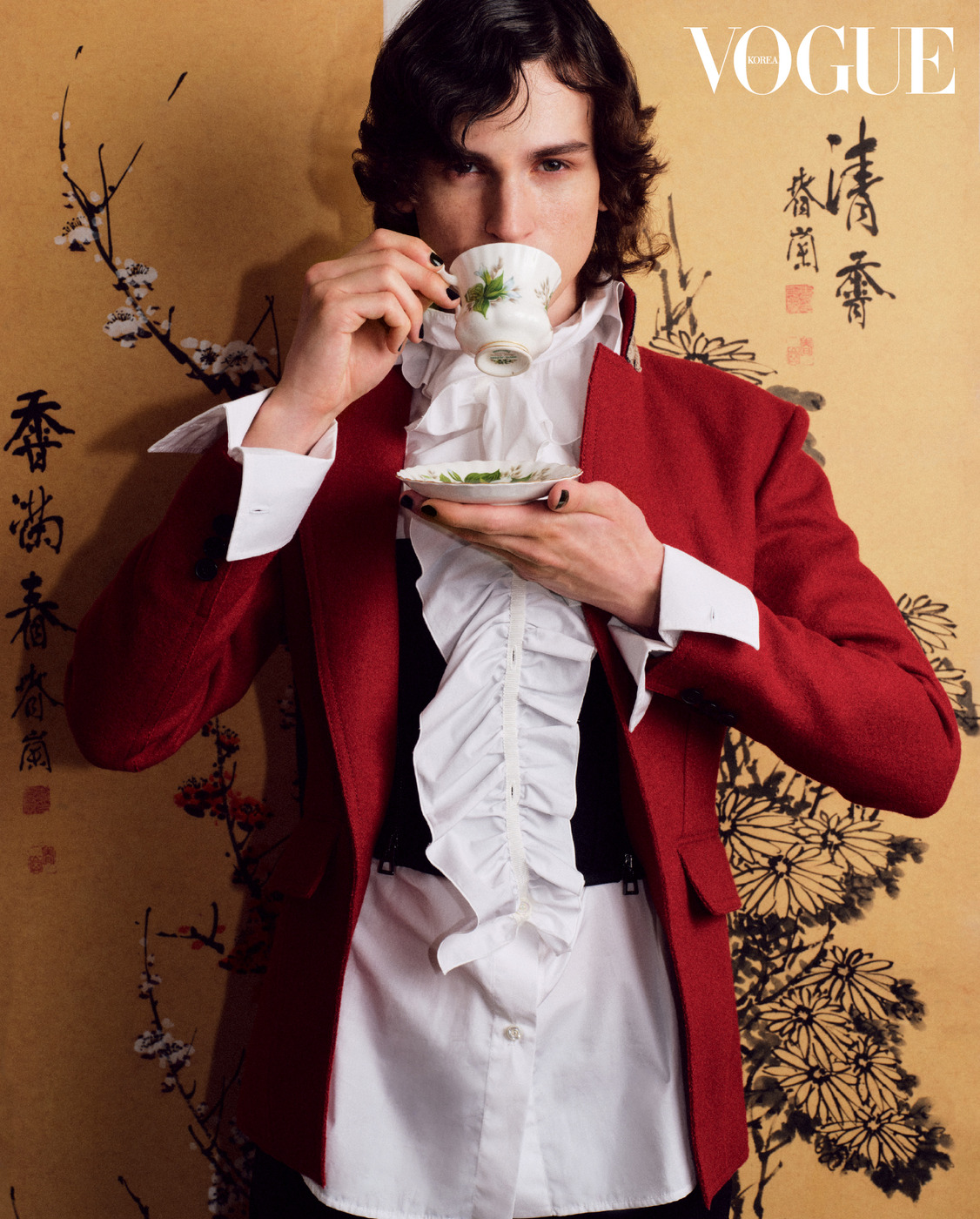 BOTH, NEITHER 섬세한 자수를 수놓은 스트랩 장식이 달린 재킷, 목에서부터 러플이 흘러내리는 블라우스, 튜더 왕조 시기의 반바지와 부츠 조합이 성별의 경계를 허문다.
