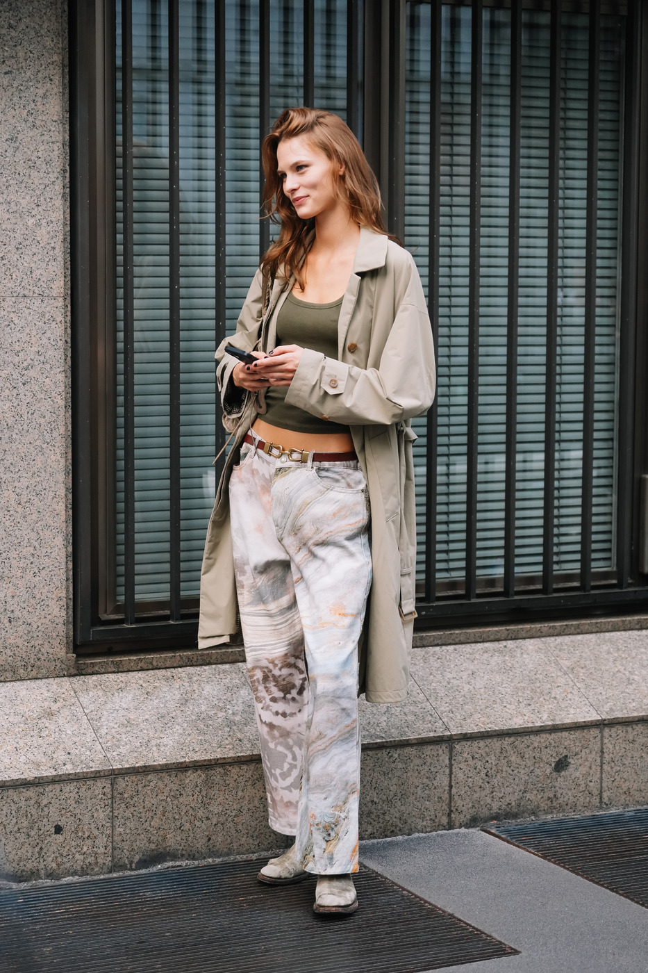 트렌치 코트 + 크롭트 톱 + 프린트 팬츠