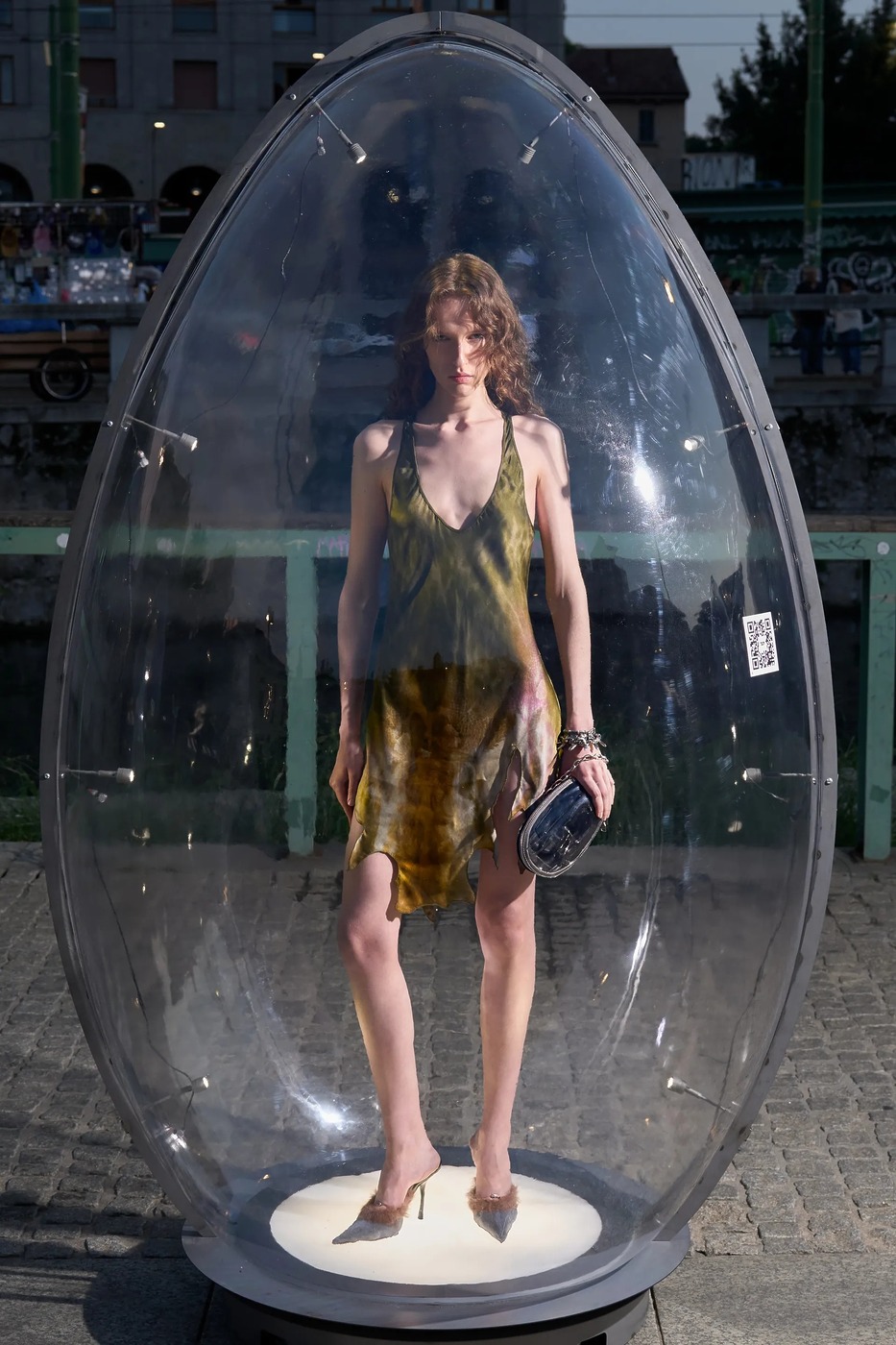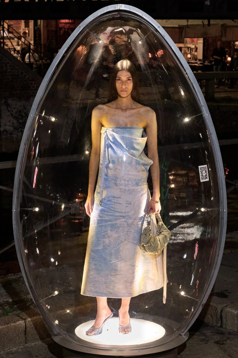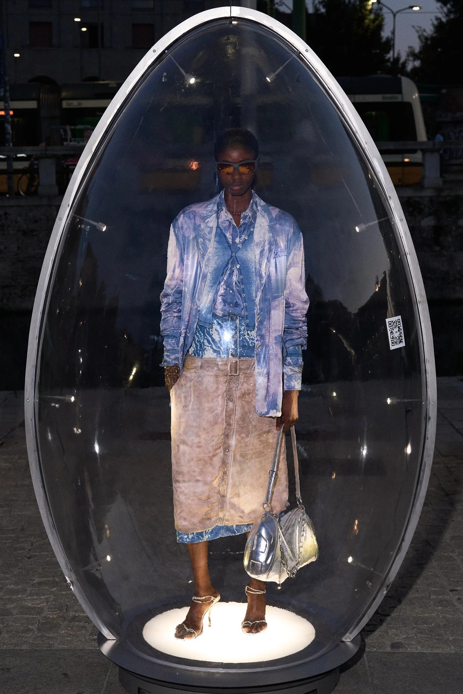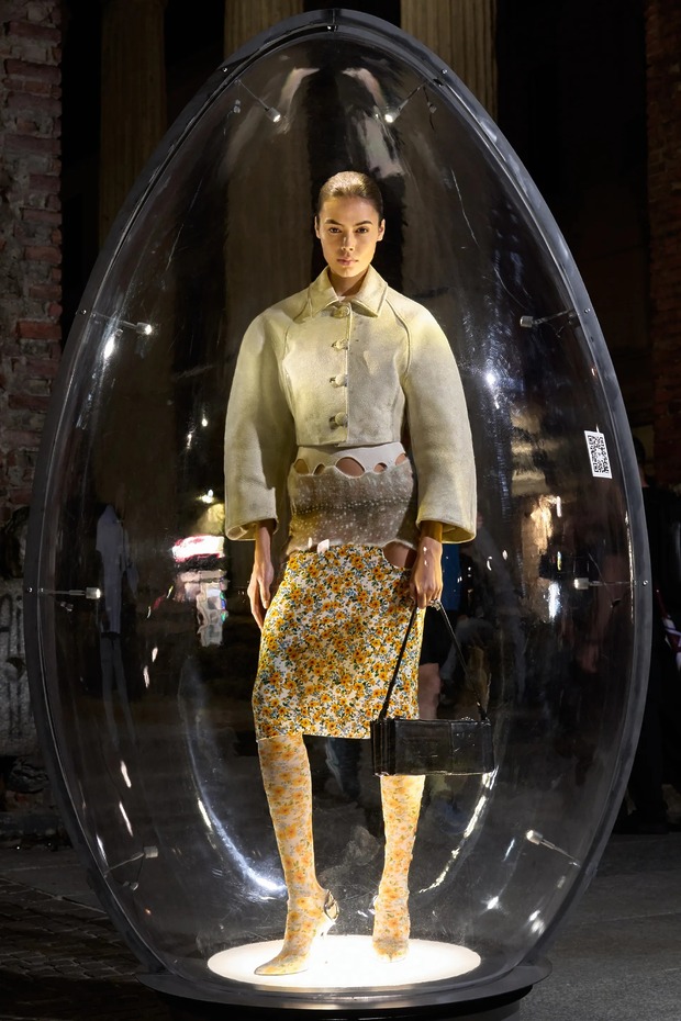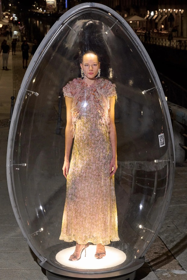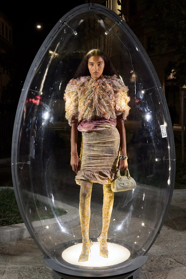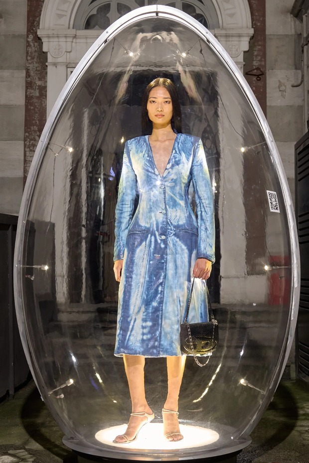 사람들이 달걀 찾기로 분주했습니다. 모두 디젤 때문에? 아니 디젤 덕분이었죠. 메종 마르지엘라 컬렉션 준비로 바쁜 글렌 마르탱이 디젤 컬렉션을 쉬어 가기로 하면서 이벤트를 준비했거든요. 이름하여 디젤 에그 헌트! 디젤은 모델 55명을 34개의 투명 달걀 안에 두었습니다. 3,000명의 사전 등록자는 밀라노 곳곳에 배치된 달걀을 찾아야 했죠. 각 달걀에 부착된 QR 코드를 통해 가장 먼저 모든 달걀을 찾는 5명에게 컬렉션 룩을 맞춤 제작해주고, 다음 5명에게는 디젤 데님 룩을, 나머지 10명은 액세서리를 선택할 수 있게 했습니다. 행운의 주인공이 총 20명인 데다 보물찾기는 늘 흥미로우니, 시내가 소란스러웠죠. 게다가 모델들이 입은 룩은 런웨이에 올리지만 않았을 뿐 새로운 요소가 눈에 띄었죠. 특히 마르탱이 자랑스럽게 여긴 새로운 소재가 있었어요. 재활용 폴리에스테르 새틴과 데님을 엮은 뒤 디스트레스트 가공한 것으로 은은한 무지갯빛이 돌아 드레스를 극적으로 만들었죠. 니트로 짠 패널과 연결한 드레스와 점프수트는 아슬아슬하면서도 액세서리가 따로 필요 없어 보였고요. 테일러링 룩은 이중 네오프렌 소재로 제작했으며, 표백제를 바르고 옷 표면의 거친 윤곽을 스텐실로 표현하는 엑스레이 기법으로 패턴을 만들어 데님의 확장을 도모했죠. 두 브랜드를 건사하려면 역시 이 정도는 돼야 하나 봅니다.
