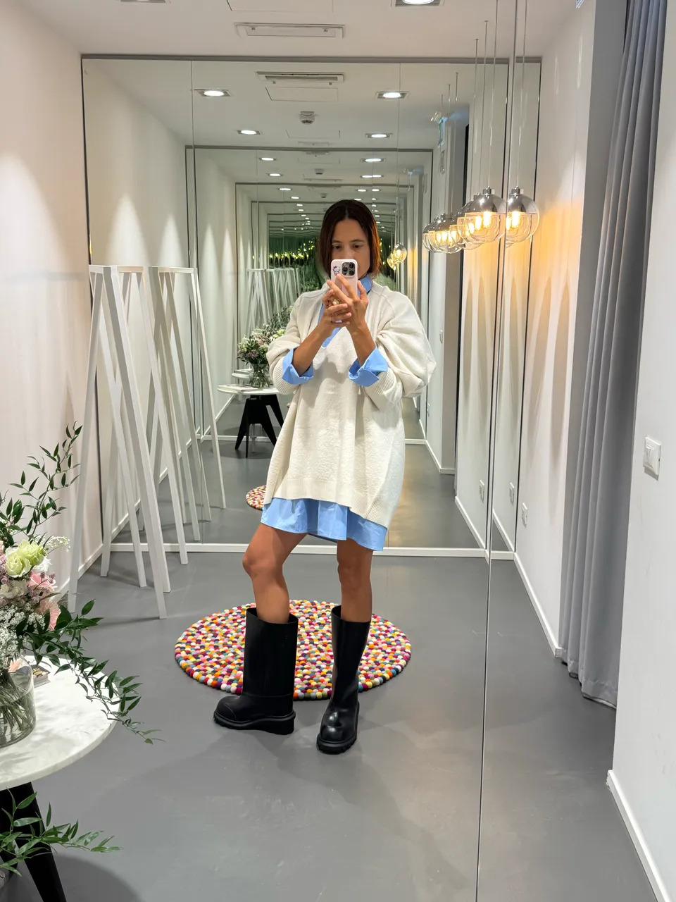 주택 담보대출, 한창 크고 있는 두 딸, 거기에 곧 강아지까지 입양할 예정이라면? 유일한 일탈은 출근할 때 멋 내는 것뿐이죠. 오버사이즈 블루 셔츠에 화이트 니트를 원피스처럼 입었어요. 거기다 블랙 롱부츠를 신었습니다. 굽은 있되, 발이 편한 게 중요하죠. 이때 저의 일탈은 스타킹을 과감히 생략하는 겁니다. 대신 불어오는 바람에 대비해 사이클 쇼츠를 챙겨 입으세요. 반란에도 상식은 필요하니까요. 소피아 카를로타 비가노(Sofia Carlotta Viganò) 시니어 뷰티 에디터 겸 디지털 디렉터