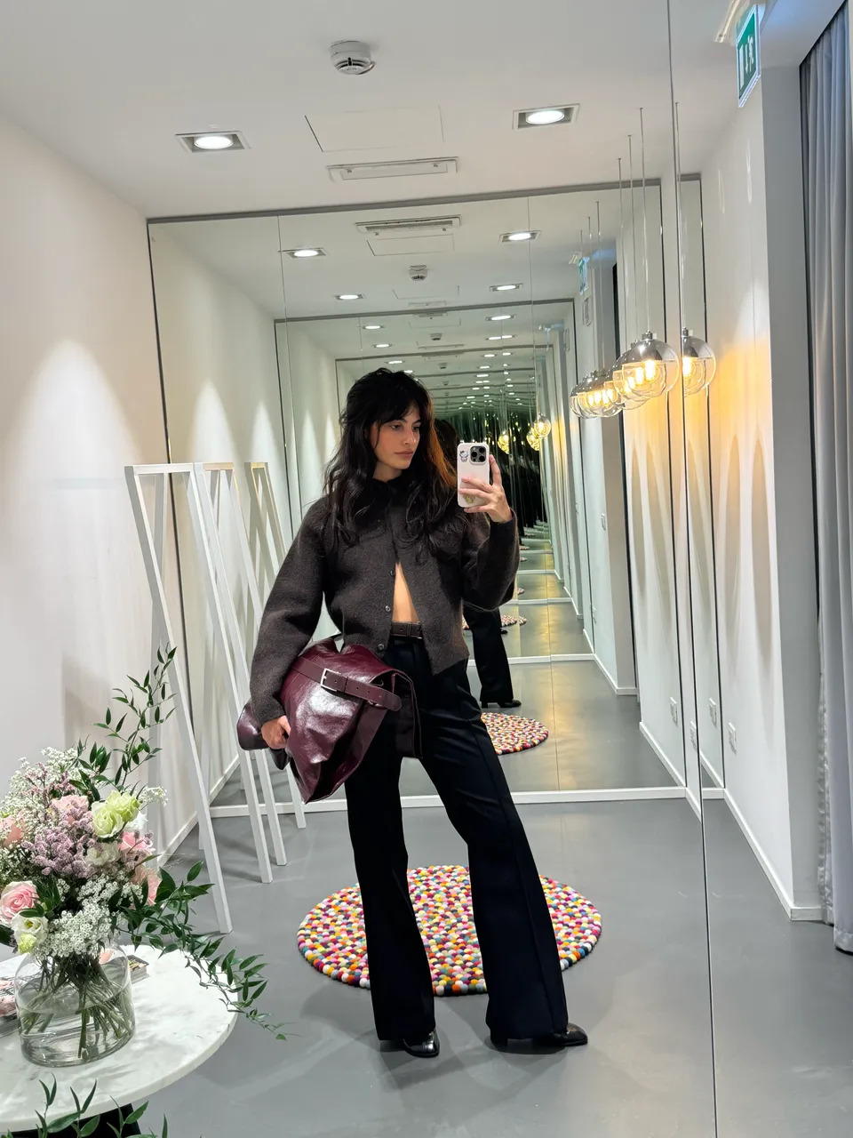 카디건을 누가 할머니 아이템 취급하나요? 단추 몇 개만 풀면 퇴근 후 데이트에도 손색없습니다. 거기에 제 출근길의 단짝 조합을 매치해줍니다. 블랙 플레어 팬츠에 앵클 부츠 조합이죠. 어떤 룩에나 곧잘 어울리며 날렵하게 마무리해주거든요. 마지막으로 버건디 백을 들었습니다. 빅 사이즈로요. 심플한 건 좋아도 심심한 건 싫으니까요. 루크레지아 말라볼타(Lucrezia Malavolta) 쇼핑 에디터