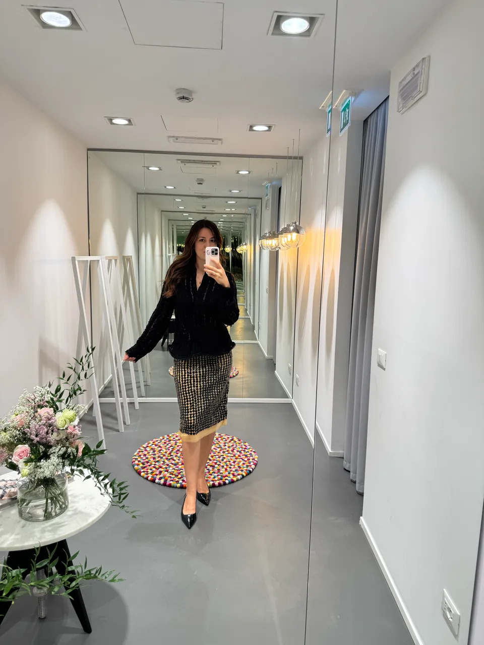 네, 또 같은 선택입니다. 블라우스와 미디스커트, 제 유니폼이죠. 허리를 잘록하게 강조하는 데 이만한 조합이 없달까요. 이번엔 블랙 자수 블라우스와 은근히 비치는 스팽글 스커트를 입었습니다. 상상할 여지를 남기는 옷차림만큼 관능적인 건 없죠. 우아하면서도 실용적인, 제가 딱 좋아하는 스타일이에요. 프란체스카 마라니(Francesca Marani) 시니어 포토 에디터