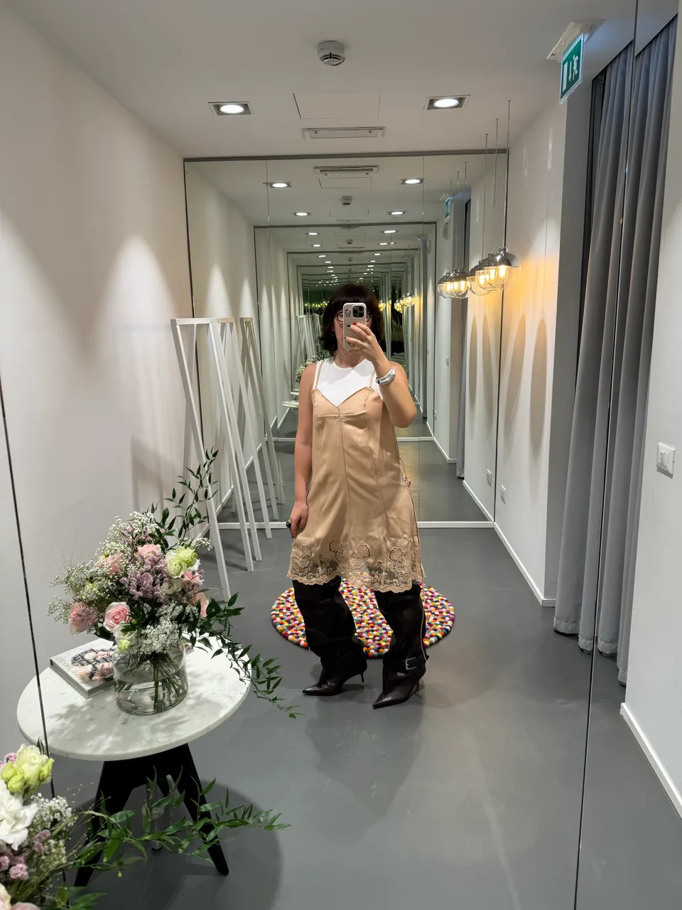 “슬립 드레스를 입고 출근한다고?” 엄마는 고개를 저었지만, 제 눈에는 예뻐 보이는걸요. 이번엔 살구색 레이스 드레스를 택했습니다. 여기에 오버사이즈 레더 부츠를 신었어요. 해적처럼 자유롭고, 패션 위크 속 에디터처럼 당당해 보이죠. 현실감각을 살리고 싶을 땐 카디건 하나면 충분합니다. 이레네 콜트리나리(Irene Coltrinari) 뷰티 에디터
