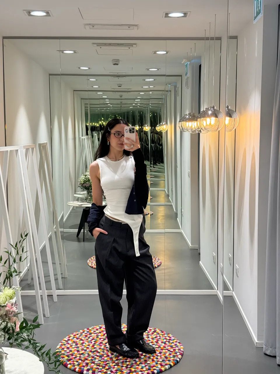 무심한 듯 멋있는 스타일을 좋아해요. 그래서 레이어드만큼은 절대 포기 못하죠. 이번엔 화이트 탱크 톱에 네이비 카디건, 그리고 울 팬츠를 매치했어요. 특히 바지의 곡선이 마음에 들어요. 허리와 발목은 타이트하되, 허벅지부터 우아하게 곡선을 그리죠. 여기에 유광 로퍼를 더했습니다. 물론 주얼리도 빼놓을 수 없죠! 엘레오노라 조르다니(Eleonora Giordani) 에디토리얼 인턴