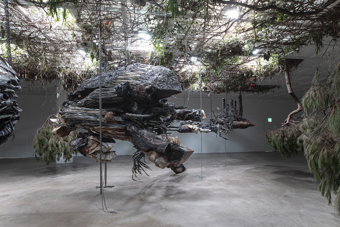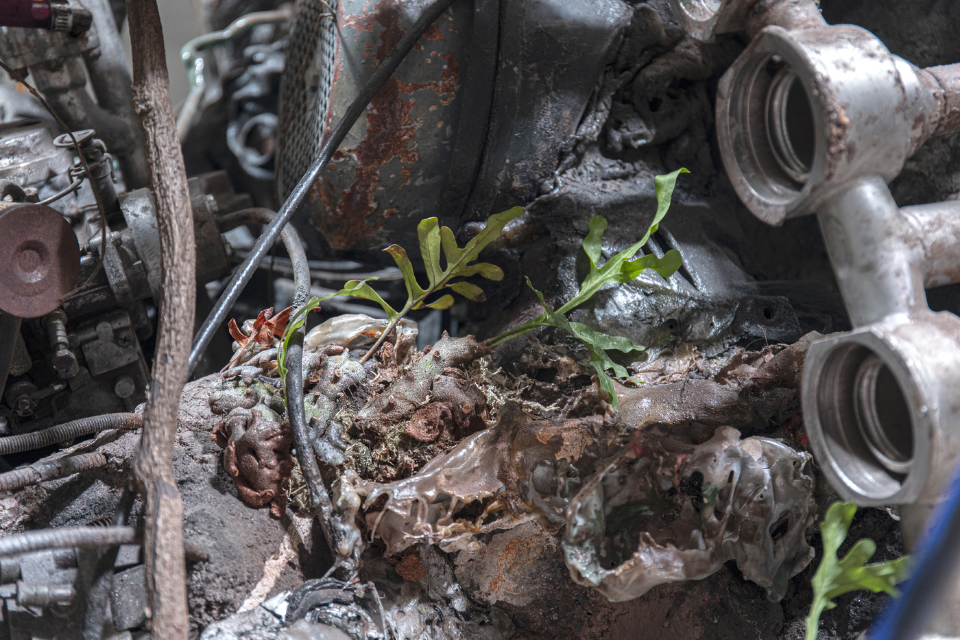 지하에서 시작되는 전시는 전시장은 물론 복도, 계단, 화장실, 극장 등에서 전방위적으로 펼쳐집니다. 기존 미술관의 구조를 해체한다는 것은 관람객들의 경험까지 바꾸어놓는 일입니다. 게다가 작가는 물리적 구조만 바꾸는 것이 아니라 온도와 습도 등 감지할 수 있는 환경조차 변화시킵니다. 인간을 중심으로 하는 것이 아니라 그 안에 놓인 흙, 불, 식물 등이 살 수 있는 곳이 된 거죠. 폐허가 된 공간을 걷다 보면 지금 보고 있는 것이 근미래인지, 과거인지, 혹은 오래된 미래 풍경인지 헷갈립니다. 이 전시의 중심에 있는 ‘타임 엔진’은 비디오게임 엔진과 AI, 그리고 가상 세계를 결합한 일종의 디지털 시뮬레이션 도구입니다. 작가는 이를 통해 생성된 가상 조각을 현실 세계에 물리적 형태로 구현하죠. 온갖 유기적, 무기적 재료가 한데 뒤섞인 이 복합체는 디스토피아 SF 영화에 등장할 법한 형상으로 보는 이들의 경계적 시간성을 흐립니다.