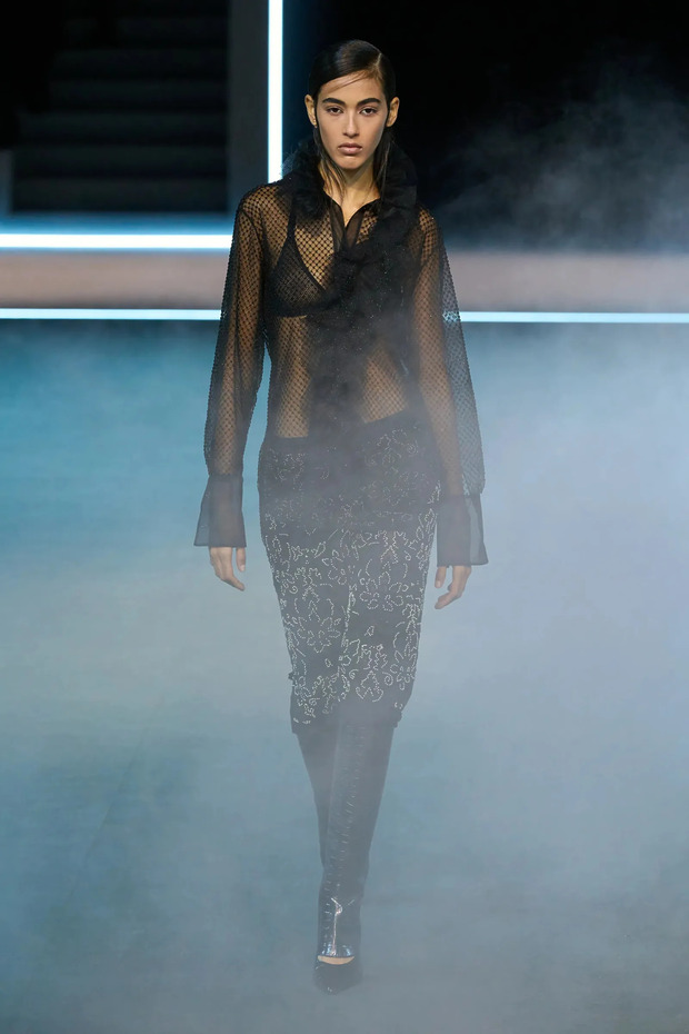 1990년대는 시스루 블라우스의 전성기였습니다. 프라다, 샤넬, 베르사체 등의 패션 하우스가 매 시즌 내놓던 단골 아이템이었죠. 브랜드마다 디테일은 달랐지만요. 스트랩 디자인부터 셔츠 칼라와 단추가 달린 구조적인 형태까지 폭넓게 변주되었거든요. 이번 시즌에도 선택지는 무궁무진합니다. 핵심은 피부를 부드럽게 감싸는 ‘소재’에 있겠고요.