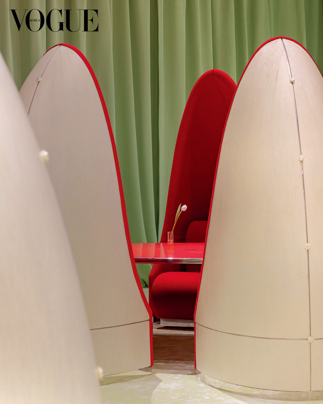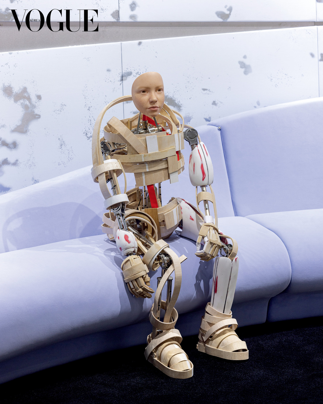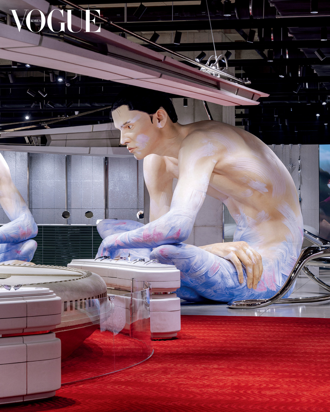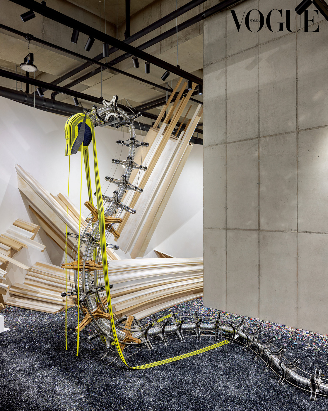 육중한 건물을 파고드는 메인 출입구가 열리면서 속내를 드러내는 하우스 노웨어 서울의 로비와 내부 공간은 전반적으로 키네틱 아트를 적극 활용해 디스토피아적 분위기를 유도한다. 론 뮤익의 작품을 닮은 인체모형과 우주적인 구조물로 영화 세트장 같은 분위기를 연출하는 2층 젠틀몬스터 공간, 은사와 데님을 결합해 바닥에 트위드를 수놓은 3층의 어티슈 섹션, 꽃잎을 형상화한 좌석이 돋보이는 5층의 누데이크 티하우스 등 구석구석 다채로운 디테일로 가득하다. “거칠고 묵직한 물성의 공간에 다채로운 컬러와 소재를 가미해 독창적인 긴장감을 일으키려 했습니다. ‘와일드와 엘레강스(Wild & Elegance)’라는 상반된 개념을 결합해 <블레이드 러너>, <프로메테우스>, <매드맥스>와 <듄> 시리즈에서 볼 법한 어디에도 없는 미래적인 광경을 구현했죠. 컬렉션을 선보이든, 홍보 영상을 만들든, 건물을 짓든, 공간에 세울 플로어 램프를 만들든 우리에게 중요한 것은 ‘새로움’입니다. 그런 점에서 아이아이컴바인드가 패션과 건축을 바라보는 시각은 동일하다고 할 수 있어요.” 화물용 엘리베이터를 그대로 활용한 게스트용 엘리베이터부터 네온 오렌지 컬러로 바닥을 뒤덮은 화장실까지 모든 실내 공간을 빠짐없이 탐방하며 개인적으로 귀여운 도깨비를 떠올렸다. 뿔이 솟은 머리, 커다랗고 맹렬한 눈과 눈썹, 날카로운 송곳니를 드러낸 입 등 하나씩 뜯어보면 무섭게 느껴지지만 함께 놓고 보면 어쩐지 친근한 도깨비처럼 하우스 노웨어 서울 역시 맥시멀한 디테일로 가득하지만 모든 것이 지극히 자연스럽고 일관되게 보였다.