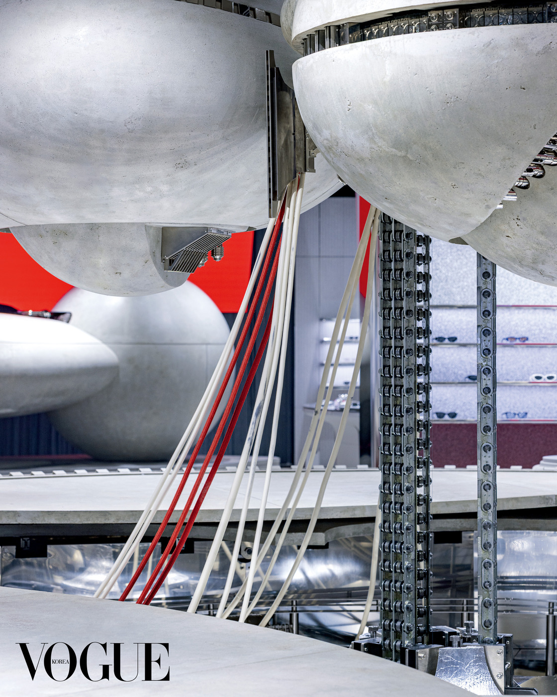 “2017년 아이아이컴바인드 신사옥 부지를 검토할 때만 해도 성수동은 지금과 같은 모습이 아니었어요. 젠틀몬스터, 탬버린즈, 누데이크, 어티슈, 누플랏이라는 브랜드를 아우르면서 수백 명에 이르는 직원이 함께 근무할 수 있는 14층 규모의 부지를 확보할 수 있는 곳이 성수동 외에는 없었죠. 하지만 성수동이 지닌 실험적이고 크래프트적인 지역적 특성이 회사의 정체성과 잘 맞아떨어졌기에 선택을 후회한 적은 없었습니다.” 정신없는 집들이를 치른 아이아이컴바인드가 <보그>에 독점으로 밝힌 공식 후일담이다. (특정 인물이 부각되길 원치 않았던 아이아이컴바인드는 내부 공간 팀과 함께 <보그>가 건넨 질문에 서로 머리를 맞대고 써 내려간 답을 건네왔다.) 설계사로 더 시스템 랩(The System Lab)을, 시공사로는 KCC건설을 선정한 후 각 분야의 전문가들은 서로 긴밀히 협력하며 ‘되돌아온 미래’라는 컨셉을 시각화해나갔다. 8년에 걸친 작업이었다. 외관과 서로 다른 브랜드로 채운 실내를 모두 관통하는 세계관, 기존에 없던 ‘퓨처 리테일’의 가능성을 증명하는 것이 가장 중요한 목표였다.